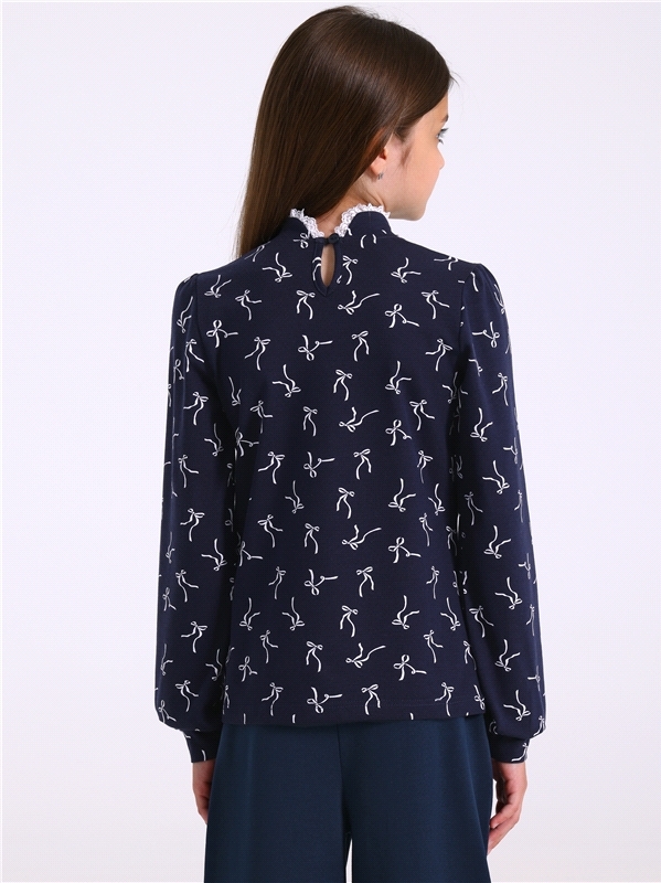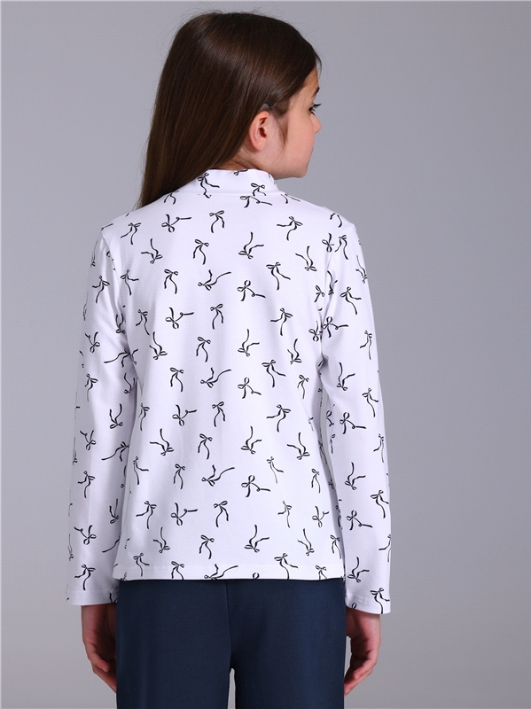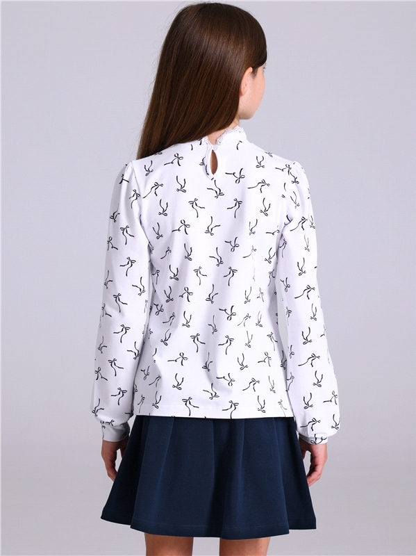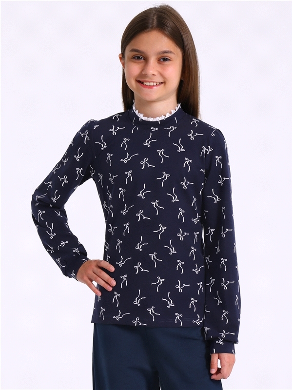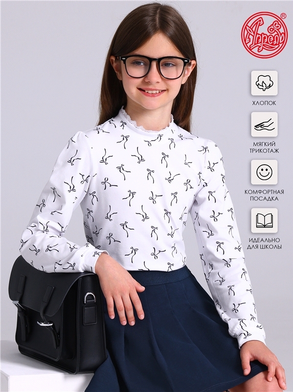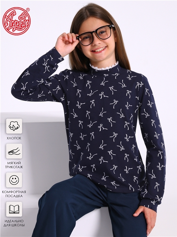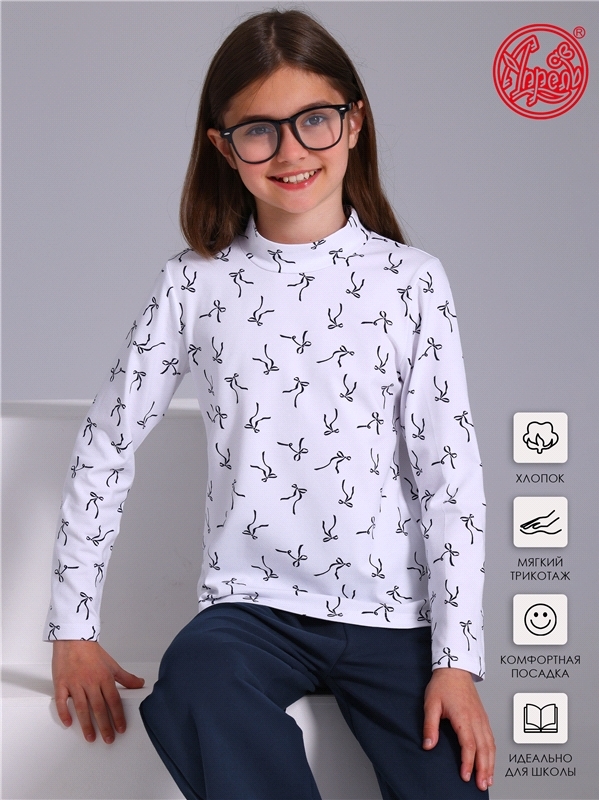 Лонгслив для девочки выполнен из кулира - легкого хлопкового полотна с лайкрой. Изделие с длинными рукавами:декорировано печатью:имитирующей кружевной воротничок. Незаменимый предмет гардероба для шко... Показать описаниельниц! Уход: только машинная стирка (руками не стирать!) при температуре 40 градусов:без предварительного замачивания. Изделия с печатью и декором перед стиркой необходимо вывернуть на изнаночную сторону. Состав: кулир с лайкрой / хлопок 92% + лайкра 8%.