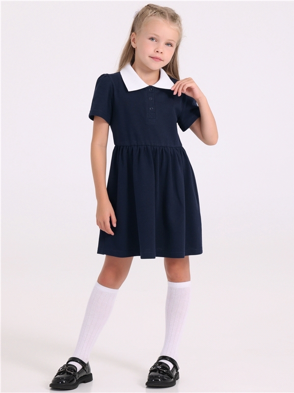 Платье-поло для девочки выполнено из хлопкового полотна. Изделие с короткими рукавами:с застежкой на кнопочки и присборенной по талии юбочкой. Отличный вариант для школы! Уход: только машинная стирка ... Показать описание(руками не стирать!) при температуре 40 градусов:без предварительного замачивания. Состав: пике / хлопок 100%.