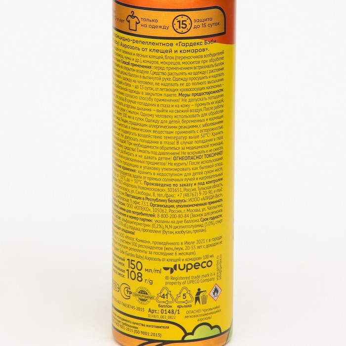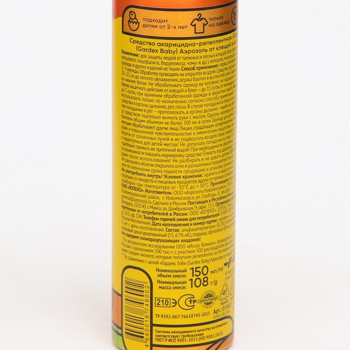 Активное вещество:Альфациперметрин - 0,2%, N,N-диэтилтолуамид - 5%, спирт этиловый денатурированный (55,2% об.), отдушка, пропеллент (бутан, изобутан, пропан).Описание:Аэрозоль от клещей и комаров Gar... Показать описаниеdex Baby - ваше спасение в сезон активности насекомых! Средство работает и от клещей, и от комаров, а значит, ваш ребенок будет полностью под защитой Gardex.Аэрозоль от комаров и клещей Gardex Baby тщательно протестирован. Парализованный клещ отпадает от обработанной одежды через 2-3 минуты, не успевая прицепиться к телу. Испытания проводили ведущие специалисты – энтомологи страны в главных научных центрах России. Эффективность подтверждена НИИ Дезинфектологии Роспотребнадзора.Помните, клещи живут в траве. На прогулке ножки и ручки ребенка должны обязательно быть закрыты одеждой. Тщательно обрабатывайте, штанишки, курточку, рукава. Средство нужно наносить заранее, чтобы одежда успевала высохнуть до прогулки. Перед применением встряхивать баллон 2-3 секунды. Обработку проводить на открытом воздухе. Средство распылять на одежду с расстояния 20-25 см до легкого увлажнения, держа баллон в вытянутой руке. Одежду просушить и надевать на нижнее белье. Не обрабатывать одежду на человеке, не надевать ее до полного высыхания. Время защитного действия от клещей и блох – до 15 суток, от летающих кровососущих насекомых – до 5 суток, при хранении обработанной одежды в закрытом пакете.