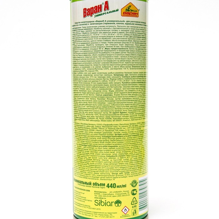 На природе и дома многие люди сталкиваются с клещами, клопами, москитами и другими опасными насекомыми, которые способны причинить массу вреда. Они переносят инфекцию, пьют вашу кровь и просто раздраж... Показать описаниеают своим внешним видом. Вы устали бороться с ними? Дихлофос от торговой марки «Варан» — высокоэффективное средство для уничтожения ползающих (тараканов, муравьёв, клопов и т. д.), а также летающих насекомых (мух, москитов, комаров). Способ применения: перед использованием хорошо взболтайте, распылите. Состав: тетраметрин 0,12 %, циперметрин 0,2 %, пиперонилбутоксид 0,4 %, отдушка менее 5 %, функциональные добавки менее 5 %, смесь бутан / пропан / изобутан более 30 %, растворители более 30 %. Способ применения: перед использованием хорошо взболтайте, распылите.
