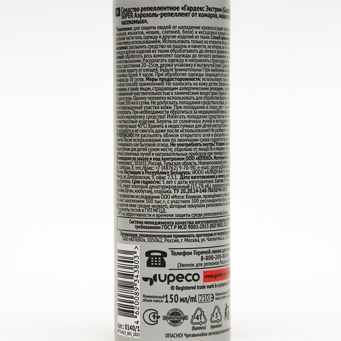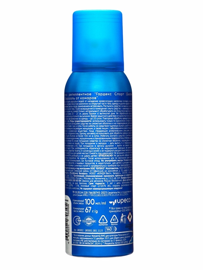 Аэрозоль от торговой марки Gardex на отдыхе обезопасит вас от комаров, мокрецов и москитов. Особенности: * распыляйте спрей только на одежду; * 15 суток защищает от клещей и 10 — от комаров при хранен... Показать описаниеии одежды в герметичной упаковке; * формула с усиливающим действием; * содержит эфирные масла репеллентных растений (можжевельника и герани). Состав: альфа-циперметрин, диэтилтолуамид, спирт этиловый денатурированный, триэтиленгликоль, отдушка (эфирные масла можжевельника и герани), пропеллент углеводородный (бутан, изобутан, пропан). Применение: 1. Перед использованием встряхните баллон. 2. Распыляйте препарат с расстояния 20?25 см на одежду до лёгкого увлажнения. Используйте её только после окончания обработки и полного высыхания. Меры предосторожности: не допускайте попадания спрея в глаза, рот и на повреждённые участки кожи, в противном случае промойте их водой. Избегайте распыления на изделия из пластика и синтетических волокон.