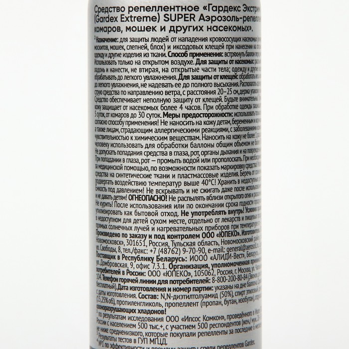 Если в теплый день Вы собираетесь на рыбалку, пикник, прогулку по лесу или возле водоема, то будьте готовы к рою насекомых вокруг Вас. Хорошо, что есть аэрозоль Gardex Extreme. Благодаря инновационной... Показать описание формуле, средство гарантирует сверхсильную защиту в течении 8 часов от комаров, москитов, слепней, мокрецов, мошек, блох, а также таежных и лесных клещей даже в местах повышенного скопления насекомых. Средство безопасно, его можно наносить на кожу или одежду и снаряжение из натуральных тканей. Аэрозоль от комаров и других летающих насекомых активен более 8 часов при применении на кожу, и до 30 суток при нанесении на одежду. Защита от клещей действует до 5 суток только при обработке одежды и при желании может быть усилена средством от клещей Gardex Extreme. Продолжительность действия и эффективность защиты подтверждена специалистами НИИ Дезинфектологии Роспотребнадзора. Аэрозоль от комаров и других насекомых Gardex Extreme сделает Ваш отдых на природе комфортным и безопасным. Состав: N,N-диэтилтолуамид (50%), спирт этиловый денатурированный (15,7% об.), пропиленгликоль, пропеллент (пропан, бутан, изобутан), отдушка