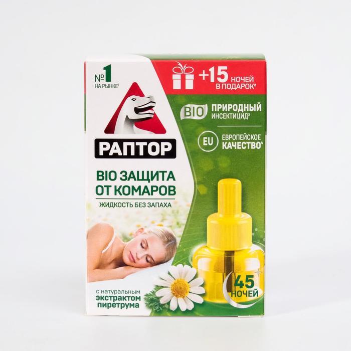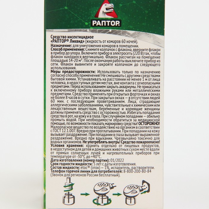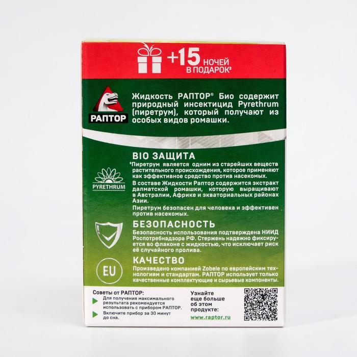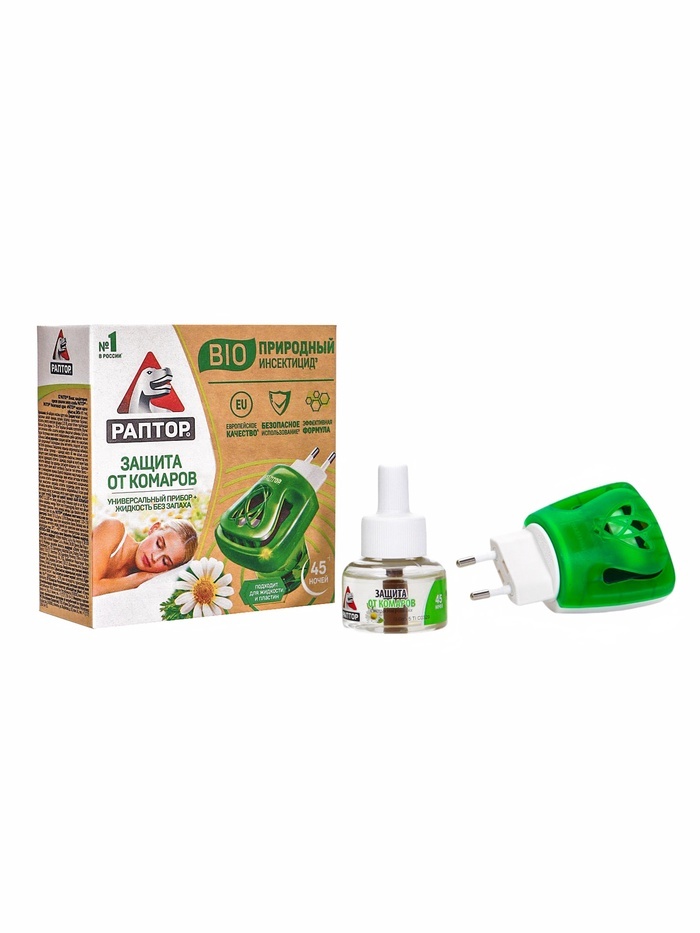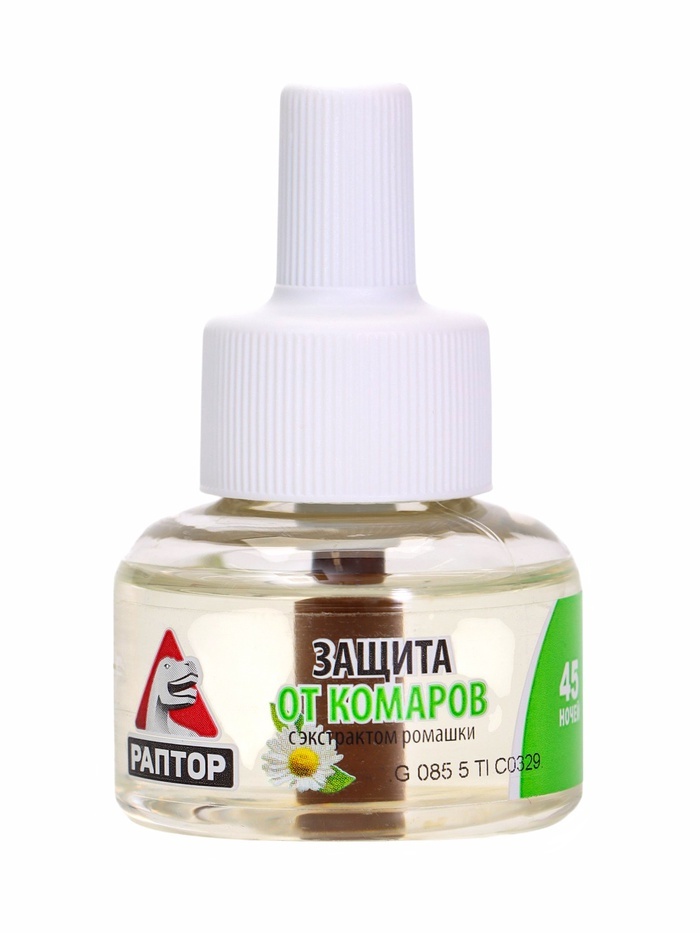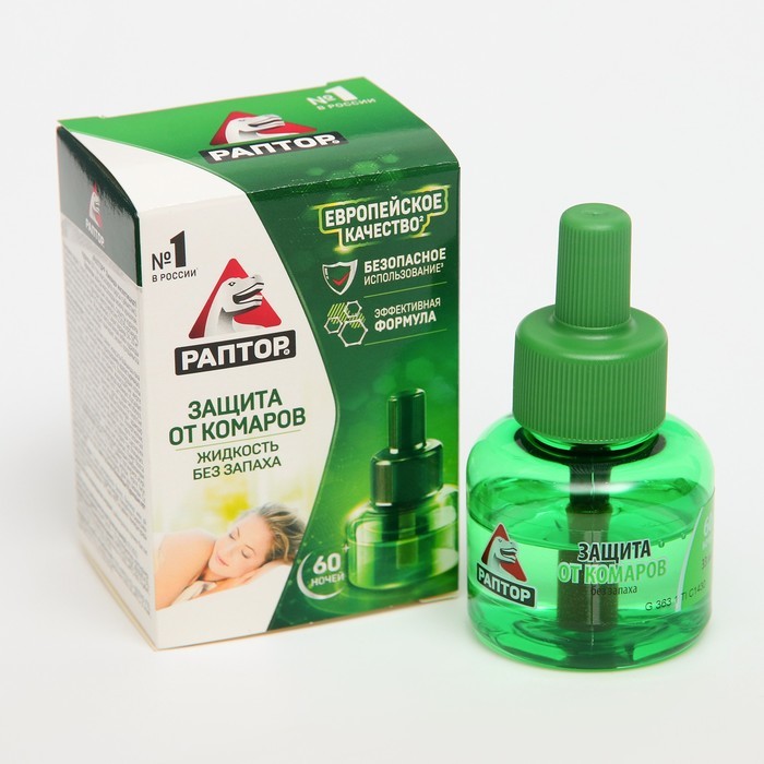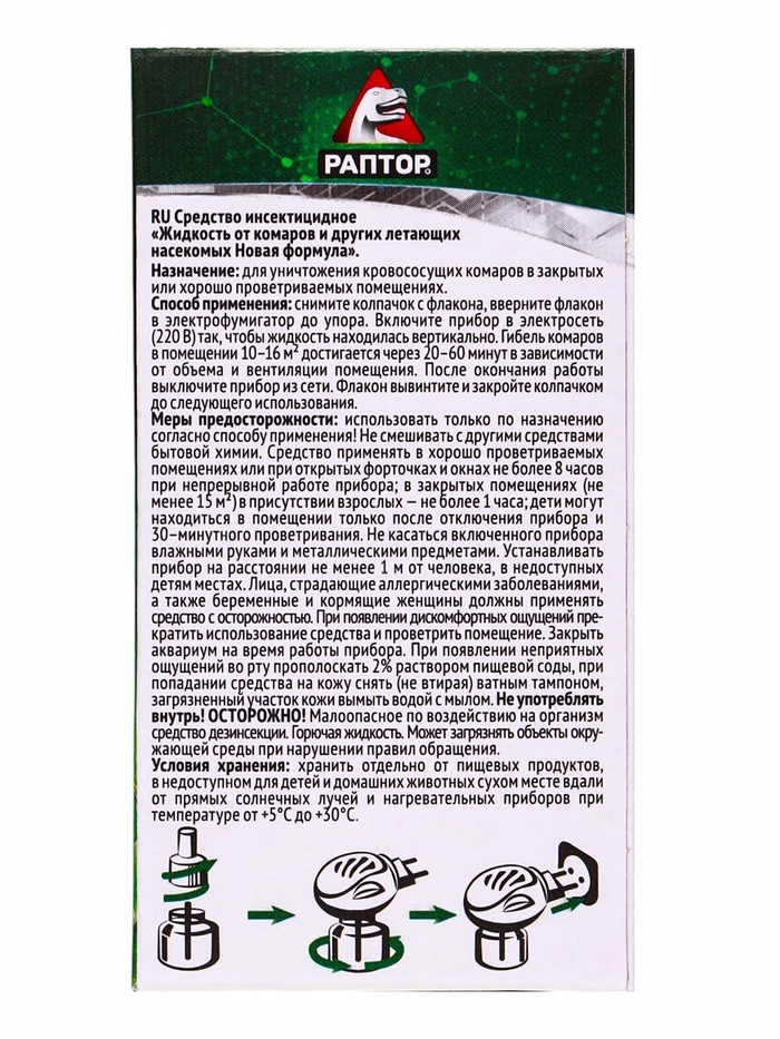 Бывает, приобретая новое средство от комаров, вы будто вытягиваете лотерейный билет - никогда не знаешь наверняка, действительно ли оно поможет в борьбе против комаров. Но если с непроверенными средст... Показать описаниевами это действительно лотерея “повезёт - не повезёт”, то в случае раптор - 100% гарантия выигрыша в виде быстрой и эффективной защиты от насекомых. Способ примененияСнимите колпачок с флакона, вставьте стержень в прибор и плотно прикрутите. Включите прибор в электросеть (220 В), поверните вилку прибора так, чтобы флакон располагался вертикально. Для быстрой защиты от комаров нажмите кнопку "TURBO" на верхней части прибора. Действие средства начинается через 8—10 минут при включении кнопки "TURBO" или через 16—20 минут без включения кнопки "TURBO". При продолжительности работы 8 часов за ночь без использования кнопки «TURBO» флакон рассчитан на работу в течение 40 ночей, при использовании с включённой кнопкой "TURBO" до 28 ночей. После окончания работы выключите прибор из сети. Жидкость можно использовать до полного испарения из флакона.Жидкость не имеет запаха, поэтому ваша защита от насекомых будет максимально комфортной и незаметной. Удобный флакон из прозрачного небьющегося материала позволяет легко отслеживать расход жидкости, чтобы вовремя заменить её на новую. А продуманная конструкция исключает риск случайного пролива. Жидкость раптор TURBO - 40 ночей спокойного сна без кошмаров! Раптор-эффект: насекомых нет!Секрет популярности жидкости от комаров раптор TURBO:Вместе с прибором TURBO позволяет в 2 раза быстрее избавиться от комаров,В составе жидкости высокоэффективное японское активное вещества etoc (эток),Специально подобранный стержень исключает риск случайного пролива жидкости,Флакончик из прозрачного, небьющегося материала,Итальянское качество,Без запаха.