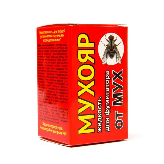 «Мухояр — жидкость от мух» (для фумигатора) Жидкость для фумигатора от мух. Препарат нового поколения Средство инсектицидное электрофумигирующее «Мухояр» — жидкость от мух. Предназначен для уничтожени... Показать описаниея мух и других летающих насекомых (комары, москиты, бабочки, моли) в помещении. Разрешено к применению в присутствии людей. Безопасность для людей установлена научными исследованиями*. Состав: вапортин — 5,5%, стабилизатор, краситель, растворители. Применение: вскрыть упаковку, достать фумигатор и флакон с жидкостью. Снять с флакона крышку, вставить стержень внутрь фумигатора и закрепить его до упора. Включить прибор в сеть так, чтобы флакон находился в вертикальном положении. Полная гибель насекомых достигается за 15–20 минут в зависимости от вида и площади помещения. Флакон объёмом 30 и 45 мл может быть использован многократно при условии хранения в исходной упаковке. Средство используют в 2-х режимах применения: в хорошо проветриваемых помещениях при открытых форточках или окнах в течение не более 2 часов в присутствии людей (кроме детей) в помещении не менее 20 м? (50 м?) и в закрытых помещениях при закрытых дверях и окнах в отсутствии людей — не менее 1 часа. После полной гибели насекомых и 30-ти минутного проветривания и влажной уборки открытых поверхностей (столы, подоконники, тумбочки) помещениями могут пользоваться и взрослые, и дети. Меры предосторожности: средство следует устанавливать в местах, не доступных для детей, вне контакта с огнеопасными предметами. Не прикасаться к электрофумигатору, включенному в сеть, влажными руками или металлическими предметами. Перед использованием средства накрыть или вынести аквариумы, террариумы и клетки с животными или птицами. Лица, страдающие аллергическими заболеваниями, высокочувствительные к химическим и лекарственным веществам, а также беременные и кормящие женщины должны применять средство с осторожностью. Средство устанавливают на расстоянии не менее 1 метра от человека. При появлении признаков дискомфортного состояния — прекратить использование средства, выключить прибор из розетки, помещение проветрить. При появлении неприятных ощущений во рту — прополоскать его 2% раствором пищевой соды. Хранить средство в местах, недоступных детям, отдельно от пищевых продуктов, в сухом помещении, при температуре от –30 °С до +40 °С, не менее 1 м от нагревательных приборов, не допускать попадания влаги и прямых солнечных лучей.