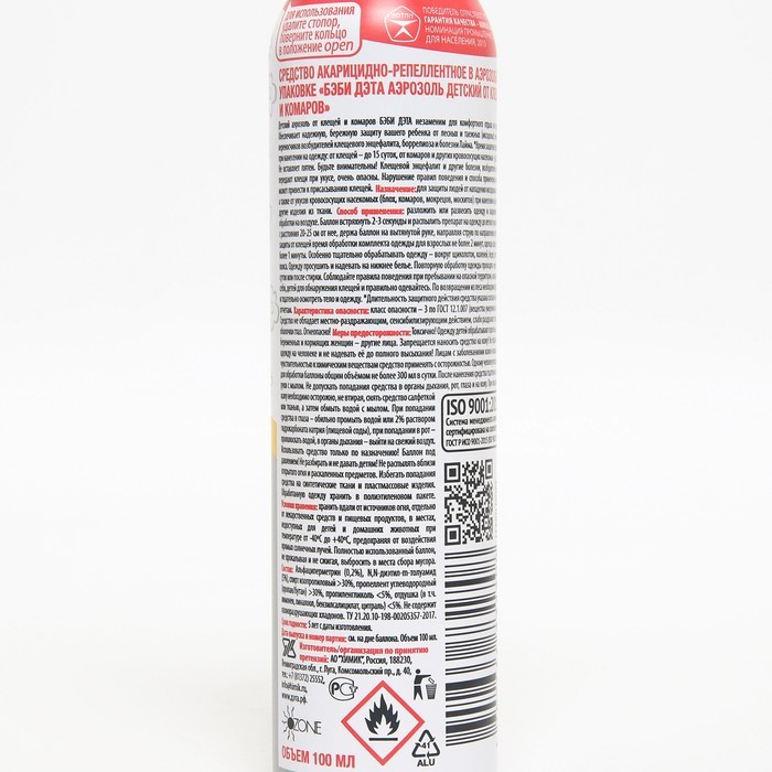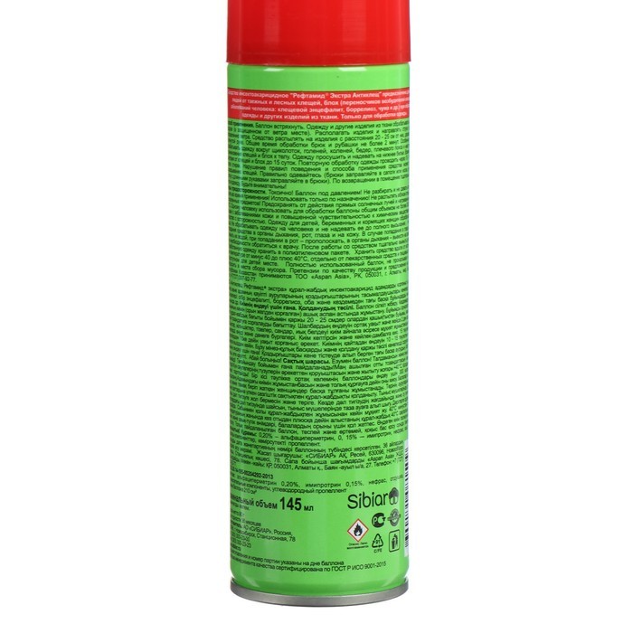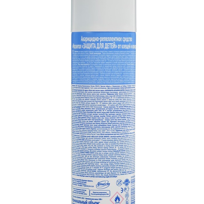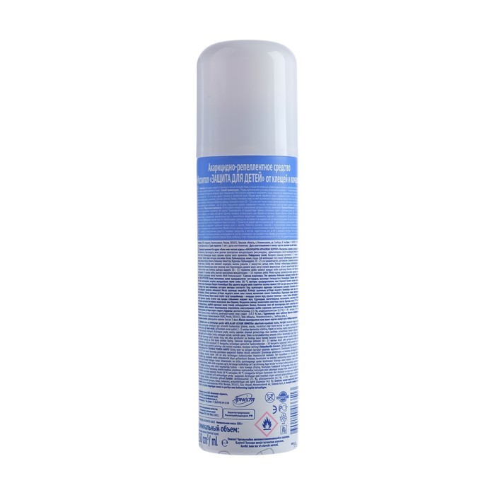 Средство инсектоакарицидное (поражение клеща) предназначено для защиты людей от таежных и лесных клещей, блох (переносчиков возбудителей опасных заболеваний человека: клещевой энцефалит, боррелиоз, чу... Показать описаниема и др.) при обработке одежды и других изделий из ткани. Только для обработки одежды. Будьте внимательны!Способ применения:Перед применением баллон встряхнуть. Одежду и другие изделия из ткани обрабатывать на открытом воздухе (в защищенном от ветра месте).Средство распылять на изделия с расстояния 20-25 см. Общее время обработки брюк и рубашки не более 2 минут. Особенно тщательно обрабатывать одежду вокруг щиколоток, голеней, коленей, бедер, плечевого пояса и мест возможного проникновения клещей и блох к телу.Одежду просушить и надевать на нижнее белье.Время защитного действия: от клещей и блох до 15 суток.ВНИМАНИЕ! Повторную обработку одежды проводить через 10–15 суток или после стирки. Нарушение правил поведения и способа применения средства может привести к присасыванию клещей. Одному человеку использовать для обработки баллоны общим объемом не более 300 мл в сутки. Не обрабатывать одежду на человеке и не надевать ее до полного высыхания. Токсично! Огнеопасно!Состав: альфациперметрин 0,2%, имипротрин 0,15%, отдушка 5%, сорбитан олеат 5%, изопарафин 5%, бутан/пропан/изобутан смесь 30%, нефрас 30%.