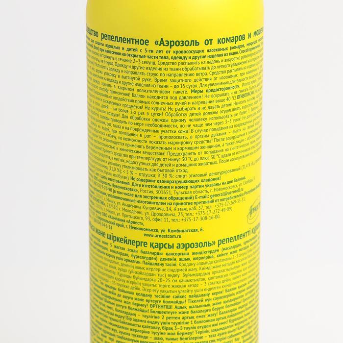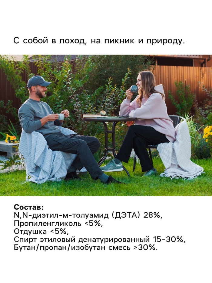 Надёжная защита от комаров в формате аэрозоля для активного отдыха. Подходит для взрослых людей — создаёт невидимый барьер, отпугивающий насекомых. Формула действует быстро и сохраняет эффект даже при... Показать описание высокой влажности или лёгкой физической нагрузке. Особенности * Удобный распылитель для равномерного нанесения на кожу или одежду. * Не оставляет липкости и резкого запаха. * Оптимален для использования на природе, в походах и спортивных мероприятиях. * Компактный флакон легко взять с собой. Как это работает Репеллент блокирует рецепторы комаров, не давая им распознать человека как цель. Средство подходит для защиты в лесу, у воды или в парке — там, где риск укусов особенно высок. Наносите его перед выходом на улицу, и насекомые будут держаться на расстоянии. Важно Перед применением проверьте кожу на чувствительность. Избегайте попадания в глаза и на слизистые. После возвращения домой смойте средство водой с мылом.