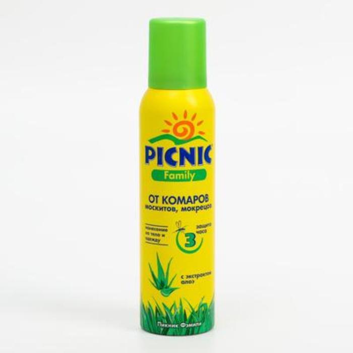 Аэрозоль от комаров, мокрецов и москитов «Picnic Family» подарит вам ощущение безмятежности и покоя, защищая от насекомых прекрасным летним днем.Средство содержит экстракт алоэ и разработано для защит... Показать описаниеы взрослых и детей (с 5 лет) от нападения кровососущих насекомых (комаров, мокрецов, москитов, мошек, слепней, блох).Его можно наносить как на открытые части тела, так и на одежду, занавеси, сетки и другие изделия из ткани.Время защитного действия от насекомых при нанесении на кожу — до 3 часов, при нанесении на одежду и другие изделия из ткани — до 5 суток.Преимущества продукта: Активная и современная действующая формула.Универсальная защита от всех летающих (комаров, мокрецов, москитов). Подходит для всех членов семьи, для взрослых и детей (с 5 лет).Удобный формат – 150мл. Состав: > 30 % алифатические углеводороды, спирт этиловый денатурированный – 37,1 % об., N,N-диэтил-м-толуамид (Дэта) – 4,5 %, пропиленгликоль, парфюмерная композиция, экстракт ромашки, экстракт алоэ, ПВП/ВА сополимер.