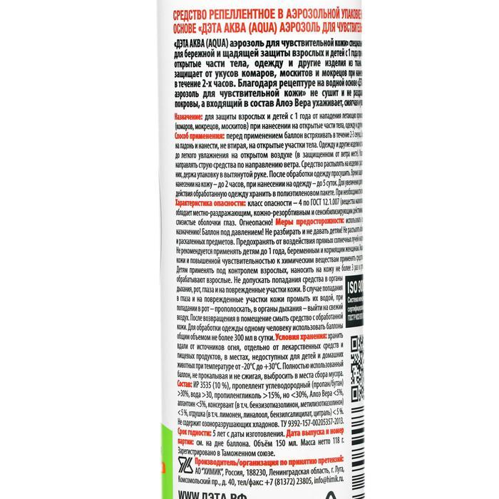 Аэрозоль Репеллент ДЭТА АКВА», от комаров, для чувствительной кожи, 150 млВопросы по товару