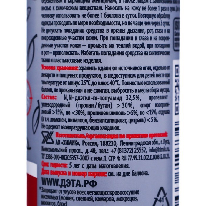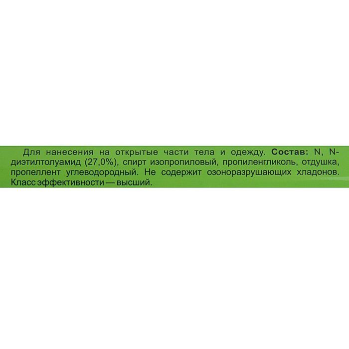 СоставN,N- диэтил-m-толуамид 32,5%, пропеллент углеводородный (пропан/бутан) >30%, спирт изопропиловый >15%, но 5%, но
