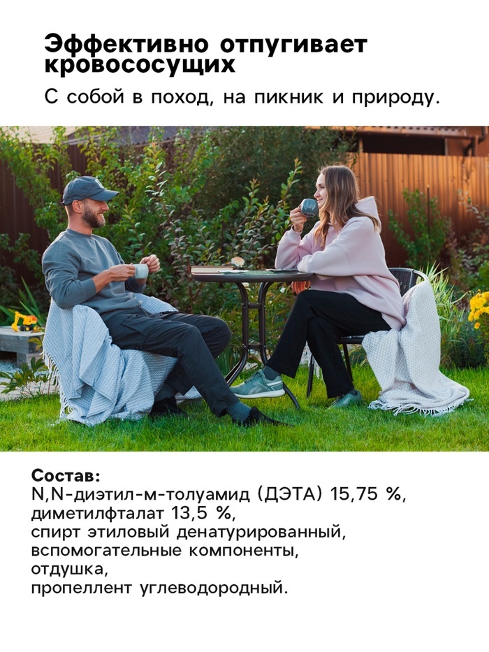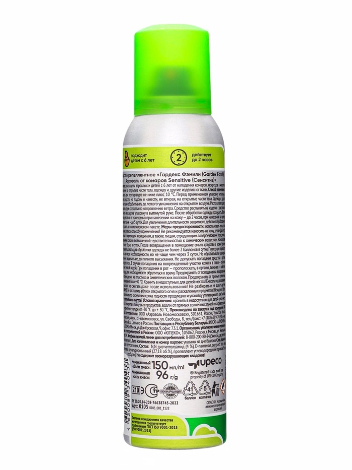 Аэрозоль для защиты семьи от комаров, включая детей с 6 лет с чувствительной кожей. Формула с пониженным содержанием активных компонентов бережно отпугивает насекомых, не вызывая раздражения. Особенно... Показать описаниести * Подходит для детей с 6 лет и взрослых * Равномерное распыление обеспечивает экономичный расход * Не оставляет жирных следов и резкого запаха * Защищает на протяжении 2 часов даже в высокой траве или у воды Как это работает Средство создаёт невидимый защитный барьер, маскируя естественные запахи тела, которые привлекают комаров. Наносите на открытые участки кожи перед выходом на улицу - одного распыления достаточно для надёжной защиты. Важно Перед первым применением проведите тест на небольшом участке кожи. Избегайте попадания в глаза и на слизистые. После возвращения домой смойте средство под душем. Храните флакон вдали от источников тепла.