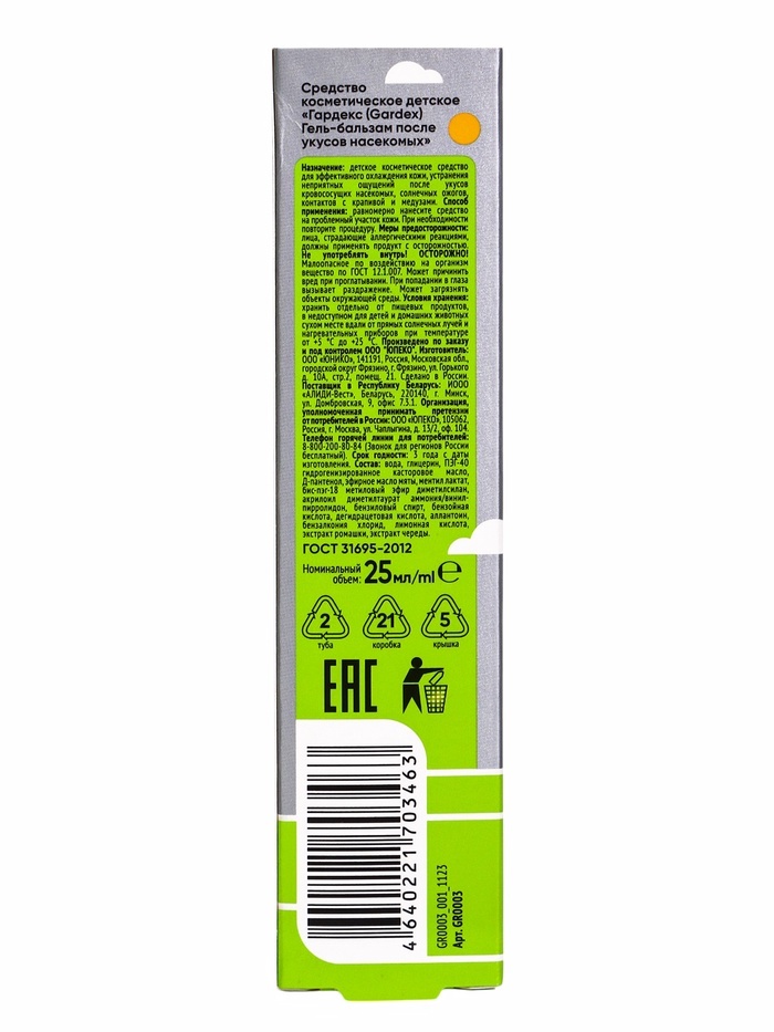 Успокаивающий гель-бальзам для кожи после укусов комаров, мошек и других насекомых. Подходит взрослым и детям с 1 года — быстро снимает зуд, уменьшает покраснение и раздражение. Лёгкая текстура впитыв... Показать описаниеается без следов, не пачкает одежду. Особенности * Мягкая формула с охлаждающим эффектом облегчает дискомфорт. * Подходит для чувствительной детской кожи. * Компактный тюбик удобно брать с собой на прогулку или в путешествие. * Не содержит красителей и резких отдушек. Как это работает Гель создаёт защитный слой на месте укуса, успокаивая воспалённую кожу. Его можно наносить сразу после укуса или при первых признаках раздражения — эффект ощущается уже через несколько минут. Важно Перед первым применением проведите тест на небольшом участке кожи. Избегайте попадания в глаза. Если раздражение усиливается, прекратите использование и обратитесь к врачу.