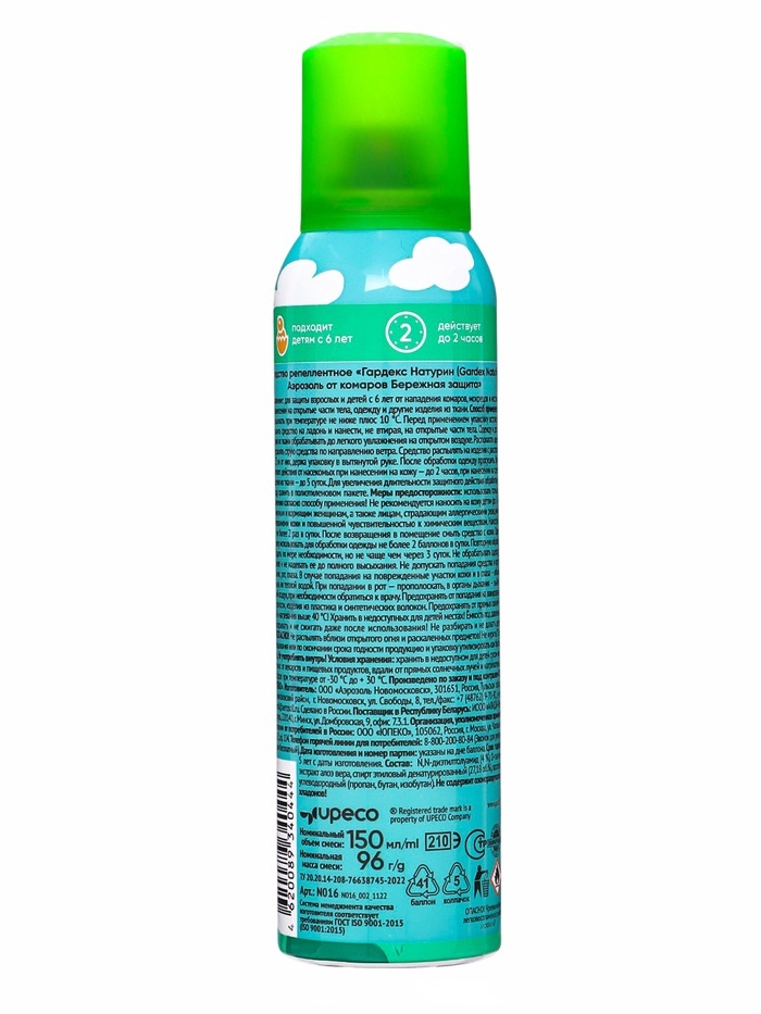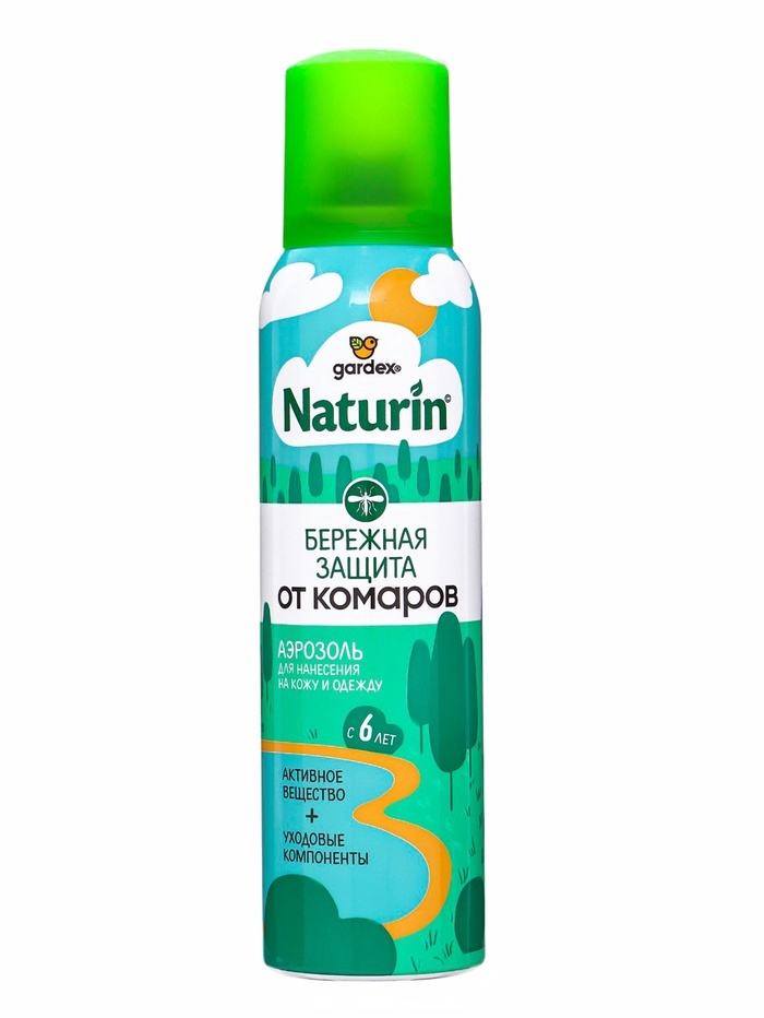 Аэрозоль от комаров, клещей и мошек Gardex Naturin Супер Сила 3 в 1 - современное репеллентное средство для защиты от кровососущих насекомых (комаров, мокрецов, мошек, москитов, слепней, блох, таежных... Показать описание и лесных клещей). Можно наносить на кожу и на одежду. Объем: 150 мл. СоставN, N-диэтилтолуамид (20%), диметилфталат (10%), этиловый спирт (25,98%), отдушка, пропеллент (пропан, бутан, изобутан).