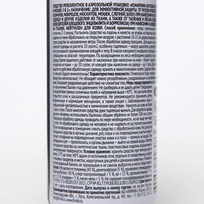 Способ применения: Использовать при температуре не ниже плюс 10°С. Перед применением баллон встряхивать в течение 2-3 секунд. Средство распылить на ладонь и нанести, не втирая, на открытые части тела;... Показать описание одежду и другие изделия из ткани обрабатывать до легкого увлажнения на открытом воздухе (в защищенном от ветра месте). Располагать одежду и направлять струю средства по направлению ветра. Средство распылять на изделия с расстояния 20-25 см от них, держа упаковку на вытянутой руке. После обработки одежду просушить. Время защитного действия: от насекомых при нанесении на кожу - до 4 часов, при нанесении на одежду и изделия из ткани - до 20 суток. Для увеличения длительности защитного действия обработанную одежду хранить в полиэтиленовом пакете. Меры предосторожности: Использовать средство только по назначению! Баллон под давлением! Не разбирать и не давать детям! Не распылять вблизи открытого огня и раскаленных предметов. Предохранять от воздействия прямых солнечных лучей и нагревания выше 40? С. Не курить во время применения! Не наносить на кожу детям (до 18 лет), беременным и кормящим женщинам, а также лицам с заболеваниями кожи и повышенной чувствительностью к химическим веществам. При попадании в глаза вызывает выраженное раздражение. Не допускать попадания в органы дыхания, рот, глаза и на поврежденные участки кожи. При попадании в глаза - промыть водой и закапать 30% раствор сульфацила натрия, при попадании в рот - прополоскать, в органы дыхания - вывести на свежий воздух. Наносить на кожу не более 2 раз в сутки. Для обработки одежды одному человеку использовать баллоны общим объемом не более 300 мл в сутки. Повторную обработку проводить не чаще чем через 3 суток. Не обрабатывать одежду на человеке и не надевать ее до полного высыхания. После возвращения в помещение смыть средство с обработанной кожи. Избегать попадания средства на синтетические ткани, пластмассовые изделия, окрашенные и лакированные поверхности. Условия хранения: Хранить средство при температуре от минус 20 С до плюс 40 С отдельно от лекарственных средств и пищевых продуктов, в местах, недоступных для детей и домашних животных. Полностью использованный баллон, не прокалывая и не сжигая, выбросить в места сбора мусора. Состав: N, N - диэтил-м-толуамид (ДЭТА) - 10%, диметилфталат (ДМФ) - 5%, (спирт входящий в рецептуру) > 30%, пропеллент углеводородный > 30%, функциональные добавки