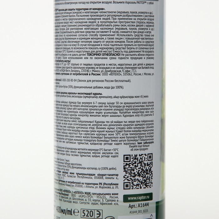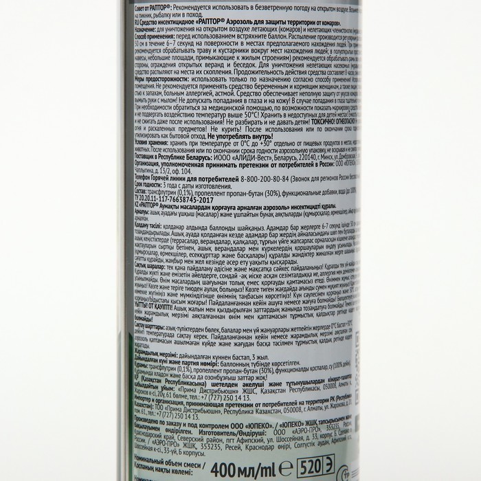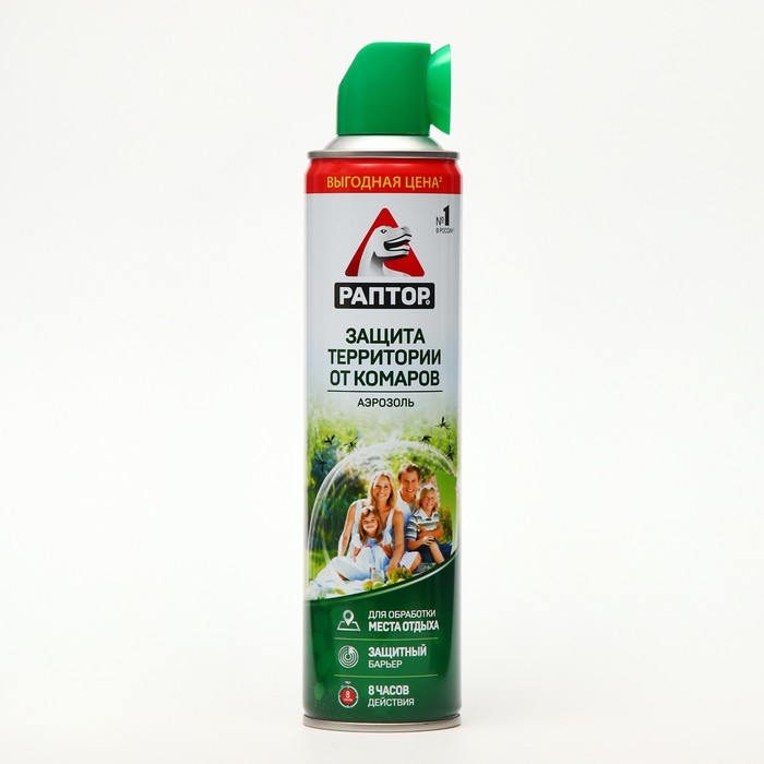 ОПИСАНИЕАэрозоль «Раптор» — это средство для распыления, защищающее территорию от комаров и других насекомых до 8 часов после обработки для применения на открытом воздухе. Уничтожает кровососущих насе... Показать описаниекомых при контакте (вещество с шокирующим эффектом, которое воздействует непосредственно на паразитов). Средство подходит для применения круглый год. Объем — 400 мл. Страна производства — Россия.ИспользованиеПеред использованием встряхните баллон.Распыление производится регулярным разбрызгиванием с расстояния 50 см в течение 6-7 секунд на поверхности в местах предполагаемого нахождения людей.При применении на открытом воздухе рекомендуется обрабатывать траву и кустарники вокруг мест нахождения людей; в полуоткрытых пространствах (террасы, веранды, навесы, небольшие площади, примыкающие к жилым строениям) рекомендуется обрабатывать рамы окон, косяки дверей с наружной стороны, ограждения открытых веранд и беседок.Для уничтожения нелетающих насекомых (муравьев, пауков, уховерток и др.) средство распыляют на места их скопления.Продолжительность действия средства составляет 8 часов, снижается при дожде и ветре. Состав: трансфлутрин (0,1%), пропеллент пропан-бутан (30%), функциональные добавки, вода (до 100%).
