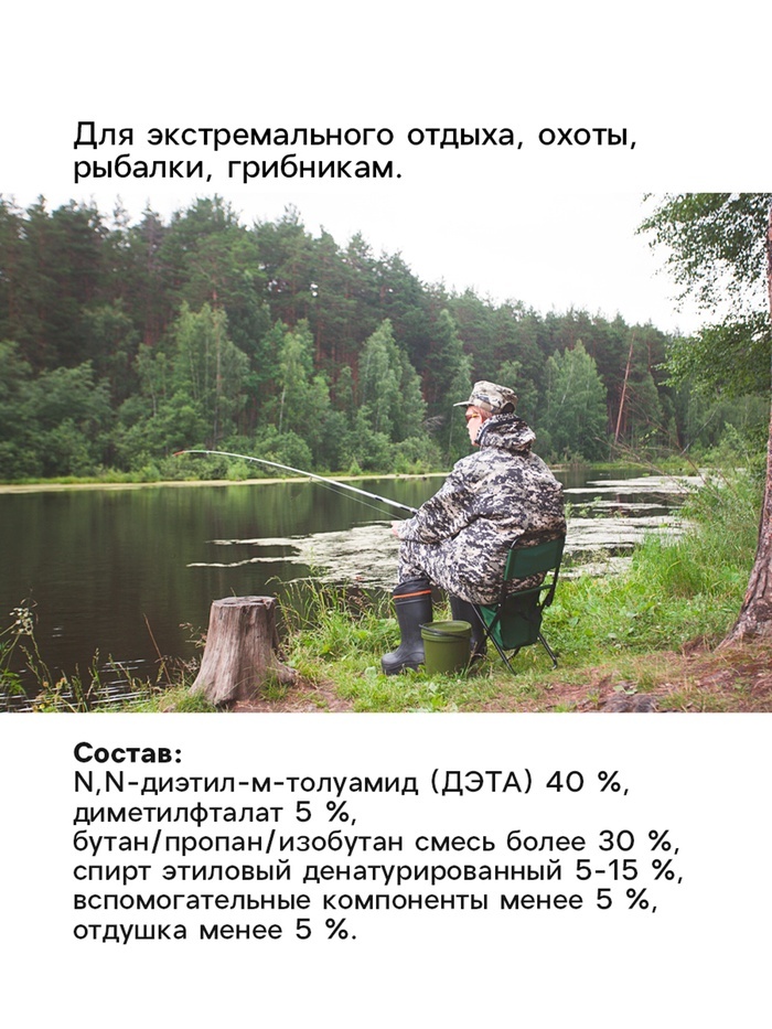 Мощный аэрозоль-репеллент для защиты от всех видов кровососущих насекомых и клещей. Создаёт надёжный барьер даже в условиях дикой природы — подходит для рыбалки, походов и работы в лесу. Особенности *... Показать описание Защищает одновременно от 6 видов насекомых: комаров, клещей, мошек, москитов, мокрец и слепней * Усиленная формула сохраняет действие до 4 часов на коже и до 5 дней на одежде * Удобный распылитель с регулируемой подачей средства * Флакон 200 мл рассчитан на длительное использование Как это работает Активные компоненты блокируют рецепторы насекомых, делая человека "невидимым" для кровососов. При нанесении на одежду образует защитный слой, устойчивый к дождю и поту. Важно Только для взрослых. Наносите на кожу только в открытых хорошо проветриваемых помещениях. Избегайте попадания на слизистые. После контакта с обработанной одеждой мойте руки. Храните в недоступном для детей месте.
