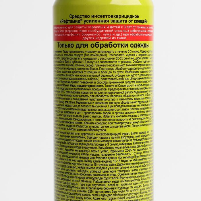 Репеллентный аэрозоль "Рефтамид" Максимум, 3 в 1 - эффективное средство защиты от нападения комаров, мошек, москитов и других насекомых. Однако, перед использованием данного продукта необходимо учитыв... Показать описаниеать следующие рекомендации:• Не рекомендуется наносить репеллент на кожу детям до 16 лет, беременным и кормящим женщинам, а также лицам с заболеваниями кожи и повышенной чувствительностью к химическим веществам. Это связано с тем, что активные ингредиенты, содержащиеся в составе продукта, могут вызвать негативную реакцию организма.• Необходимо избегать попадания репеллента в органы дыхания, рот, глаза и на поврежденные участки кожи. В случае попадания продукта на указанные участки тела, необходимо обильно промыть их водой.• Повторную обработку не рекомендуется проводить чаще, чем через 3-5 суток.• После работы со средством необходимо тщательно вымыть руки с мылом. Это позволит избежать попадания активных ингредиентов продукта на другие участки тела и предотвратить негативную реакцию организма.Время защитного действия:от насекомых при нанесении на кожу — более 4 часов, при нанесении на одежду — до 30 суток;от клещей при нанесении на одежду — до 5 суток;Способ применения: встряхните баллон. Распылите средство на ладонь и наносите, не втирая, на открытые части тела. Одежду обрабатывайте до лёгкого увлажнения с расстояния 20–25 см. Для защиты от клещей наносите препарат на весь комплект одежды из расчёта 20 сек/м?. Особенно тщательно обрабатывайте области вокруг щиколоток, коленей, бёдер, плечевого пояса, манжет и других мест возможного проникновения клещей на тело. Состав: N, N – диэтил-м-толуамид (ДЭТА) 28,0%, (спирт входящий в рецептуру) * ;>30 %, бутан/пропан/изобутан смесь 30%, пропиленгликоль