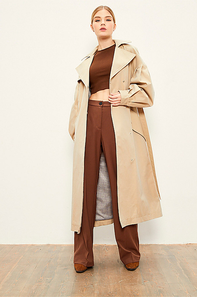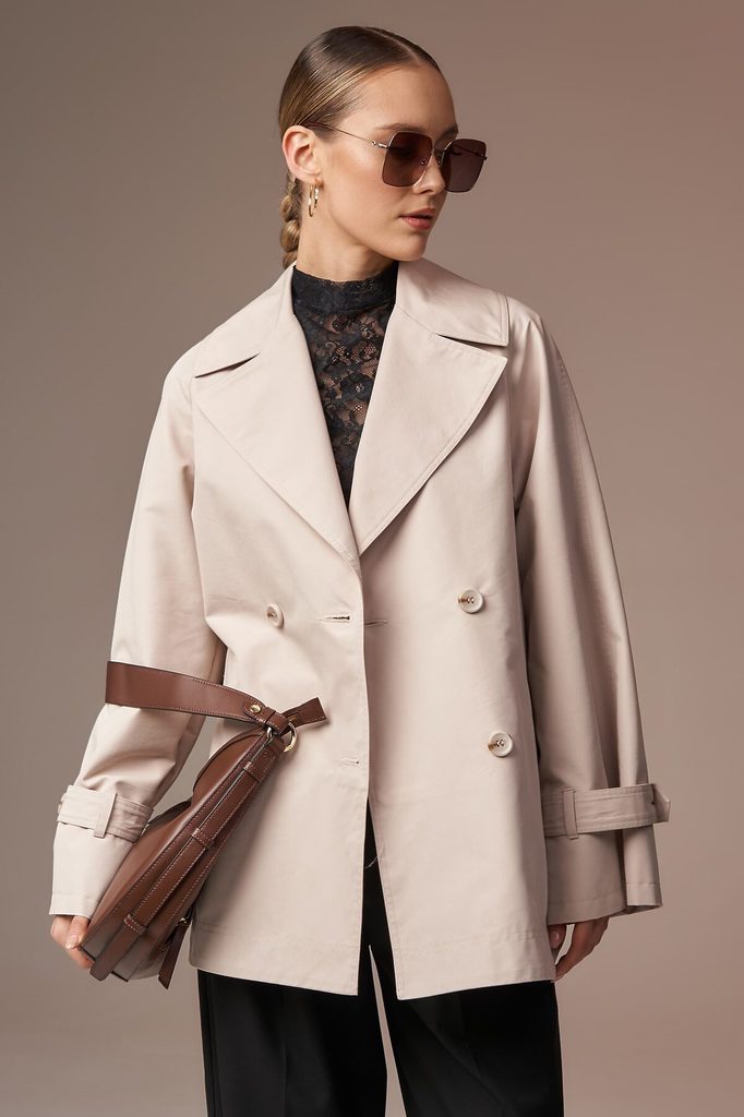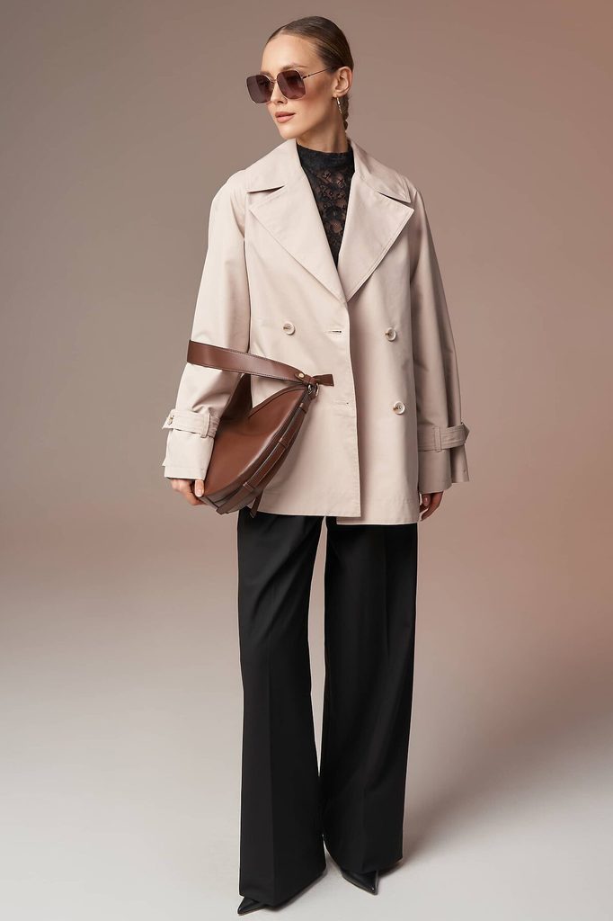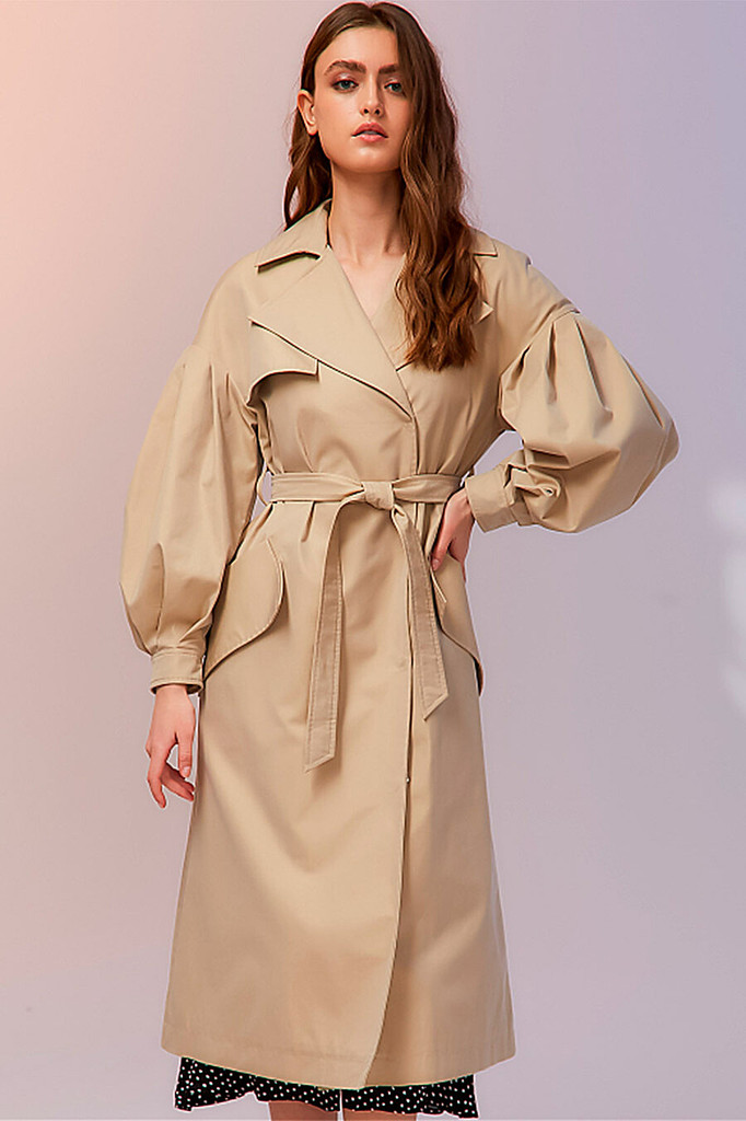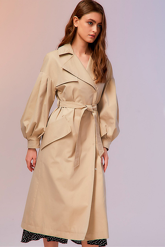 Женский плащ свободного кроя. Акцентные рукава со складками и со спущенной линией плеча, низ оформлен манжетой. Горловина оформлена английским воротником, имеются два кармана с листочкой, застежка на ... Показать описаниепотайных кнопках. В изделии имеется внутренний карман. В комплекте прилагается пояс из основной ткани. Ткань изделия хлопкосодержащая обработана качественной водоотталкивающей пропиткой. Изделие без утепления, рекомендуемый температурный режим от +17°C до +23°C. Длина изделия: 120 см. Длина рукава: 64 см. Размеры: 42 - 54. Цвета: светло-бежевый / черный.