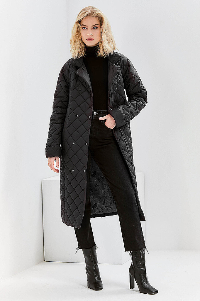 Стильный стеганый однобортный плащ прямого силуэта с кантами и утяжкой на уровне талии. Застежка на кнопках. Кулиска выполнена из эко-кожи. Рукав со спущенным плечом. Имеются два кармана с листочками ... Показать описаниена кнопках. Есть внутренний карман. Ткань изделия обработана качественной водоотталкивающей пропиткой. Утепление нового поколения ORSOTERM 100 гр., рекомендуемый температурный режим от +10°C до +18°C. Длина изделия: 120 см. Длина рукава: 64 см.