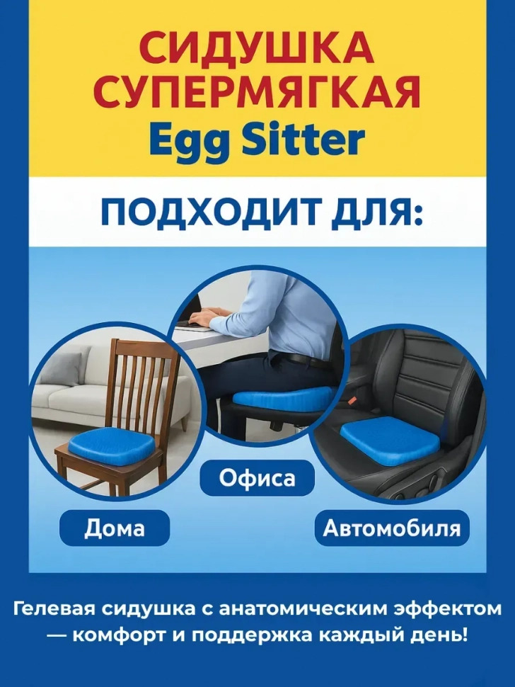 ГЕЛЕВАЯ ОРТОПЕДИЧЕСКАЯ ПОДУШКА ДЛЯ СИДЕНИЯ EGG SITTER Ортопедическая гелевая подушка с эффектом памяти — идеальное решение для комфортного сидения в любых условиях: дома, в офисе, в машине, в поездках... Показать описание и на даче. Благодаря инновационной ячеистой структуре и гиперэластичному гелевому материалу она равномерно распределяет давление, снижает нагрузку на позвоночник и копчик, обеспечивает амортизацию и вентиляцию. Назначение: подушка для сидения, для стула, для кресла, для автомобиля, для инвалидов, послеоперационная, для беременных и пожилых Эффект: ортопедическая разгрузка позвоночника, профилактика геморроя и простатита, помощь при остеохондрозе, радикулите, грыже Преимущества: — Снимает напряжение и усталость — Подходит для всех типов стульев — Воздухопроницаемая структура «пчелиные соты» — В комплекте: съёмный моющийся чехол — Не скользит, легко чистится, сохраняет форму Размер: универсальный Материал: гипоаллергенный эластомер-гель Кому подойдёт: взрослым, детям, водителям, офисным работникам, пожилым, беременным