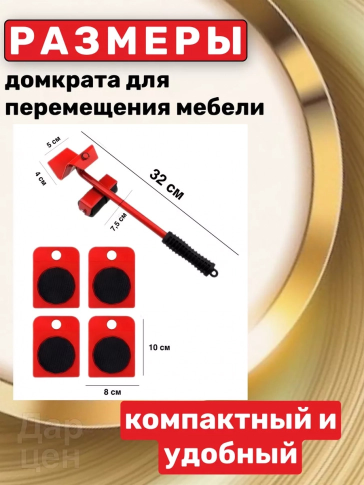 Транспортер для перемещения мебели - универсальный комплект инструментов, предназначенный для перестановки самых разнообразных вещей. В него входит широкое множество решений, использовать которых можн... Показать описаниео в качестве подъемника для мебели. Домкрат идет с колесиками и рычагом, благодаря которому вы можете осуществить поднятие тяжелых вещей и поставить на прочные платформы для транспортировки. Мебельный транспортёр поможет снизить нагрузку, а также с легкостью передвинуть любой предмет из пластика, дерева, металла или любого другого типа сырья.