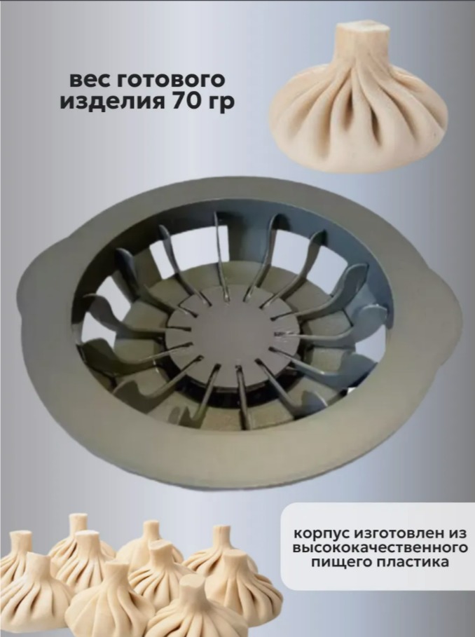 Хинкальница это уникальный и универсальный кухонный пластиковый аппарат для формовки и лепки, который значительно ускорит процесс создания хинкали и других блюд. Отлично подходит для лепки хинкали из ... Показать описаниедомашнего а также готового магазинного теста для хинкали. 14 складок теста, круг теста диаметром от 14 до 17см. Оптимальный вес хинкали 65 грамм, диаметр около 6см, высота 4-5см. Хинкальницу можно мыть в горячей воде и в посудомоечной машине. На аппарат в открытом виде выкладывается тесто, предварительно раскатанное в тонкую лепешку диаметром от 14 см. На лепешку выкладывается начинка. Нажатием на внешнее кольцо приводятся в действие лепестки аппарата, которые приподнимают края теста и формируют мешочек с красивыми и равномерными складками. Далее руками формируется хвостик и обрезается лишнее тесто. Хинкали готов.