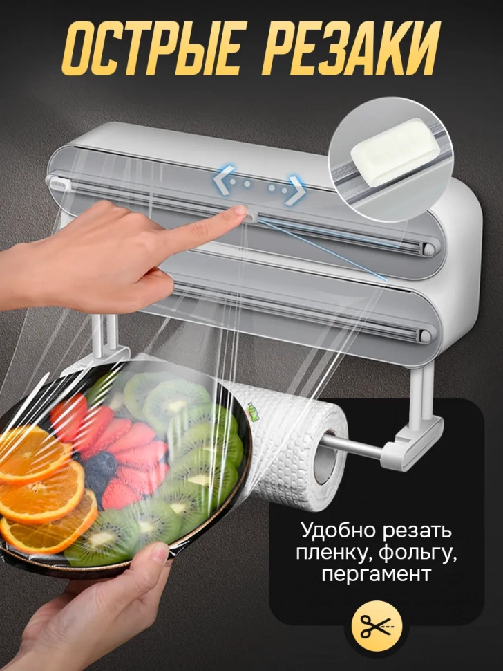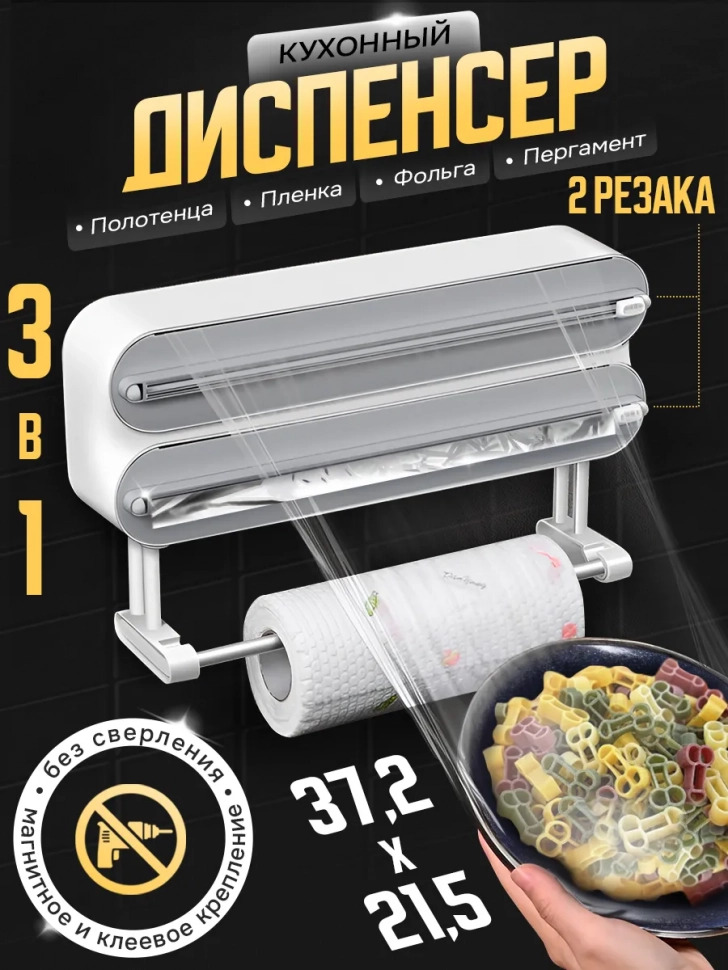 Органайзер на кухню 3 в 1 станет замечательным помощником и подарком для каждого, кто ценит порядок и удобство. Настенный держатель для бумажных полотенец, фольги, пищевой пленки и пергаментной бумаги... Показать описание легко вписывается в любую кухонную обстановку, создавая функциональное рабочее пространство. Подвесной двойной бокс имеет два регулируемых держателя для пленки, фольги или пергамента. Максимальная длина рулона 31,5 см. Также снизу можно установить дополнительный держатель для полотенец, максимальная длина рулона 28,7 см. Диспенсер кухонный подвесной легко и быстро устанавливается на любую гладкую ровную поверхность. Крепление на стену без сверления может быть двумя способами: магнитное на холодильник или самоклеящееся на стену с крючками в комплекте. Встроенные острые резаки, которые работают в двух направлениях, обеспечивают точные разрезы пищевой пленки или пергаментной бумаги, делая этот органайзер действительно незаменимым гаджетом для кухни. Больше не нужно беспокоиться о неровных краях или сложностях с отделением пленки — эти проблемы решены навсегда! Диспенсер имеет современный стильный внешний вид и отличается простотой ухода за его элементами — идеальное приспособление на вашей кухне на долгое время. Теперь все необходимые аксессуары всегда под рукой, облегчая домашние дела.