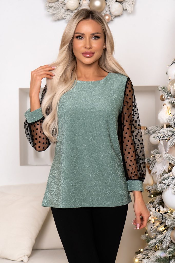 Трикотажная блузка цвета фисташки с добавлением люрекса – это стильное изделие, которое сочетает в себе комфорт и элегантность. Блеск люрекса придает блузке особенное сияние, делая ее заметной и привл... Показать описаниеекательной. Рукава выполнены из воздушного гипюра, добавляя образу женственности и романтичности. Такая блузка станет отличным выбором для создания как повседневных, так и более торжественных образов.