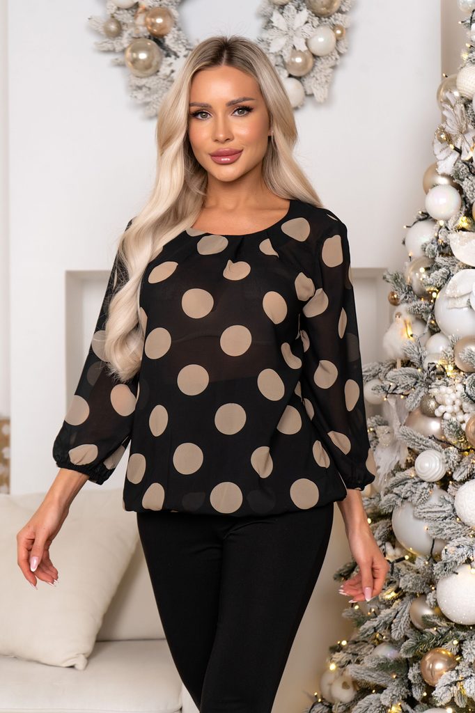 Черная блуза с крупным горохом внизу, выполненная на резинке, сочетает в себе элегантность и комфорт. Резинка по нижнему краю позволяет создать стильный объемный силуэт, а оригинальный принт добавляет... Показать описание образу яркости и индивидуальности. Идеальный выбор для создания как повседневных, так и нарядных образов.