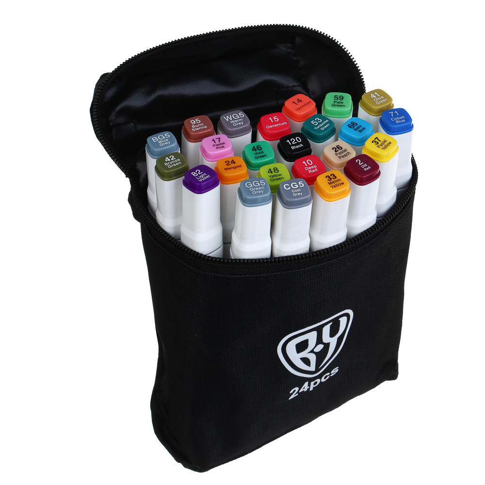 BY Набор маркеров для скетчинга, 24 цвета, 2-сторонний, кисточка/круглый, чехол