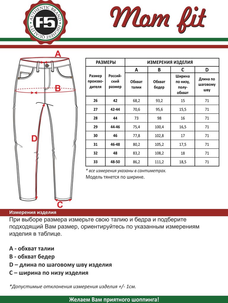 Цвет: стирка темная Состав: 98%Хлопок, 2%Эластан Материал: Black denim 2012 str Вес материала: 9.4 Фит: Mom fit Талия спереди: высокая Талия сзади: высокая Ширина колена: 20,5см Ширина низа: 16см ID: ... Показать описание123535 Описание Женские классические ретро джинсы с пятью карманами с использованием лучших традиций 90-х. Посадка Mom fit, высокая талия спереди и сзади, свободные в бедре и зауженные к низу укороченной длины. Застежка на молнии. Выполнены из эластичной ткани denim comfort  stretch. Классическая средняя стирка "stone wash". Параметры указаны для размера 28.  Длина шагового шва - 73,5 см. Рекомендации по уходу * * * * * Стирать в стиральной машине при температуре 30° Не использовать отбеливатель Ручная стирка при температуре 30° Гладить при минимальной температуре Химчистка недопустима