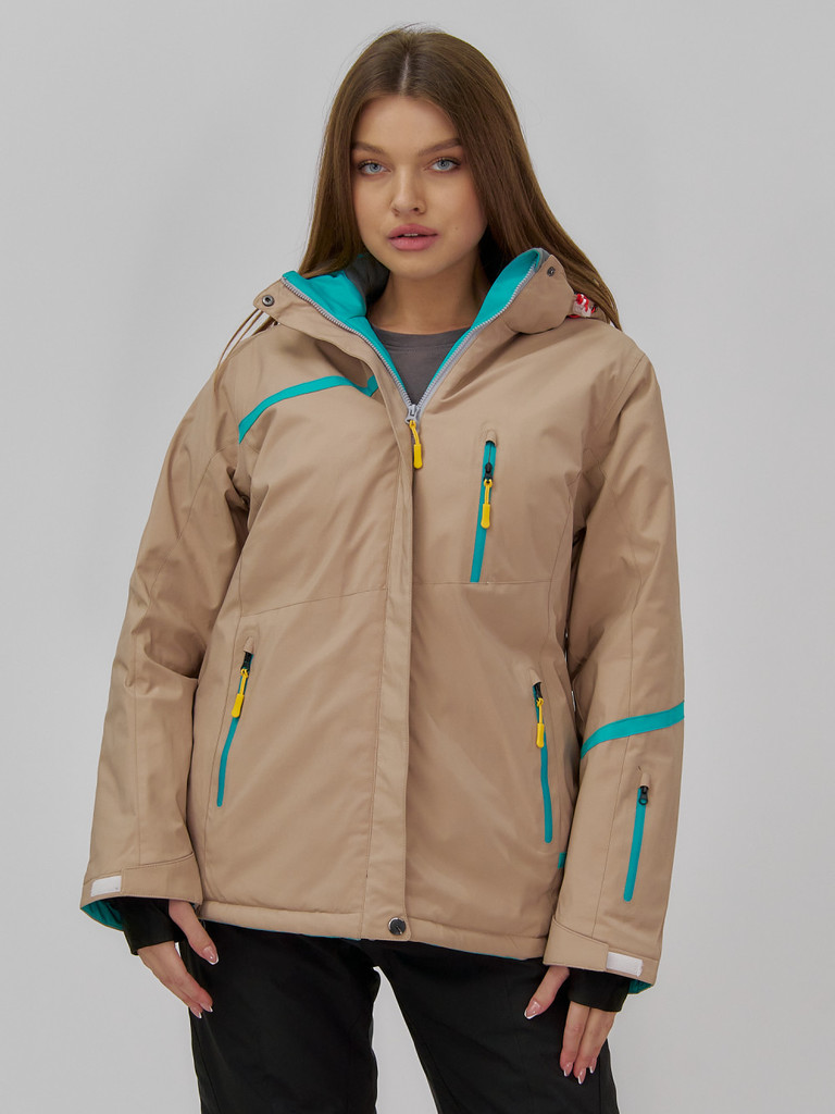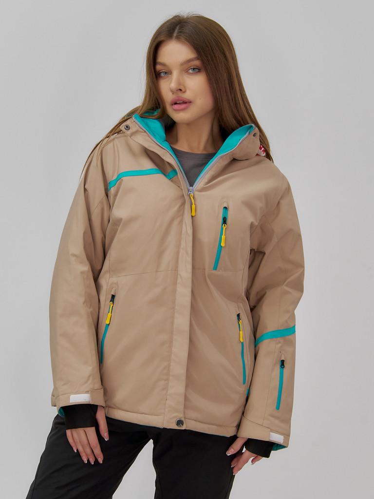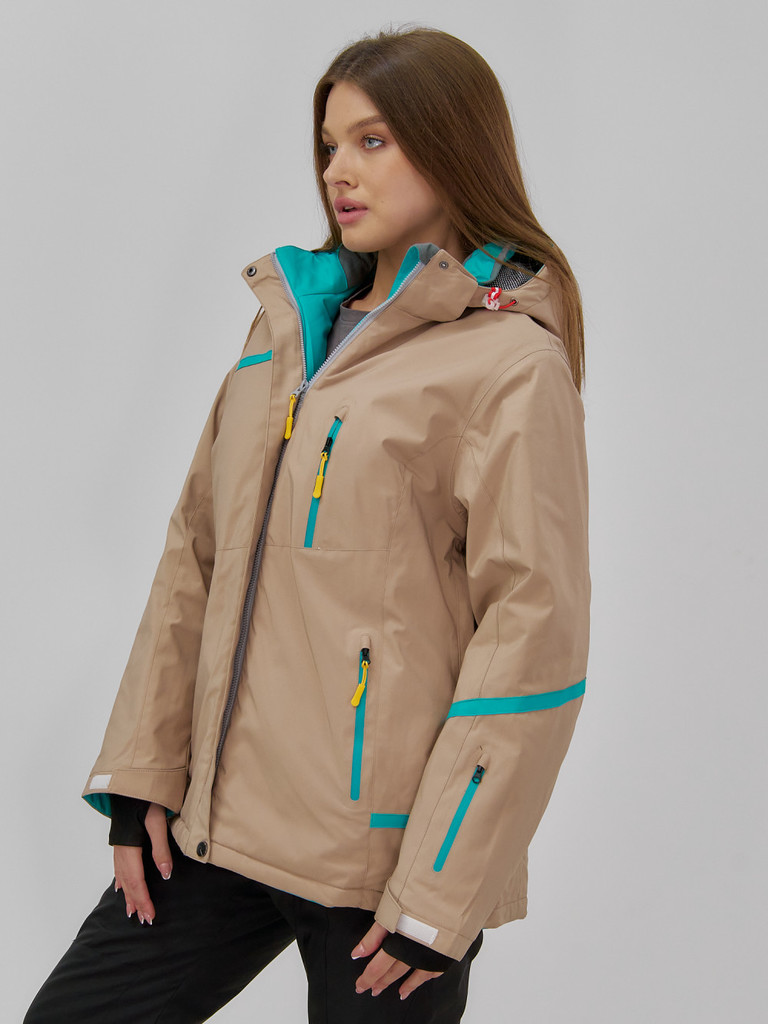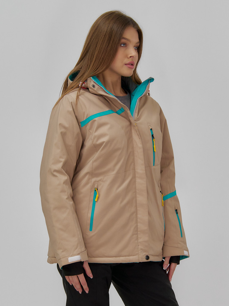 Горнолыжная куртка женская зимняя большого размера бежевого цвета 7093BВопросы по товару