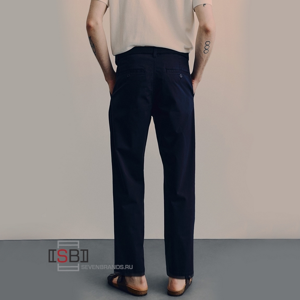 Брюки-чиносы из приятной, лёгкой ткани. Два боковых кармана и два задних кармана на пуговицах. Плетеный ремень с металлической пряжкой. Замеры по изделию: р.38/32  ОТ 102  ДИ  108