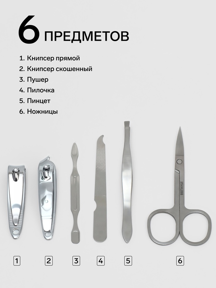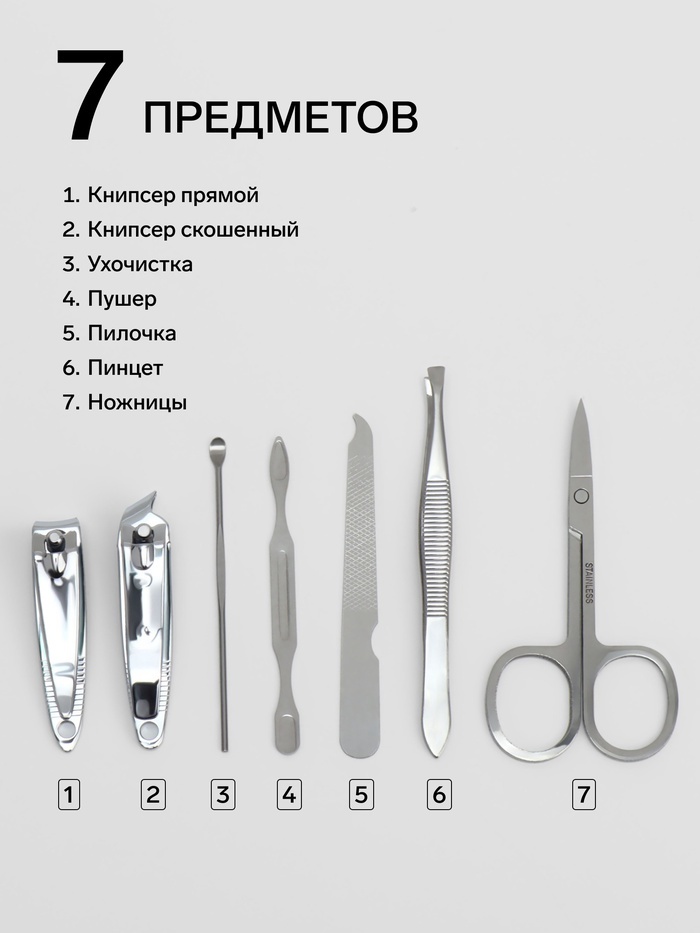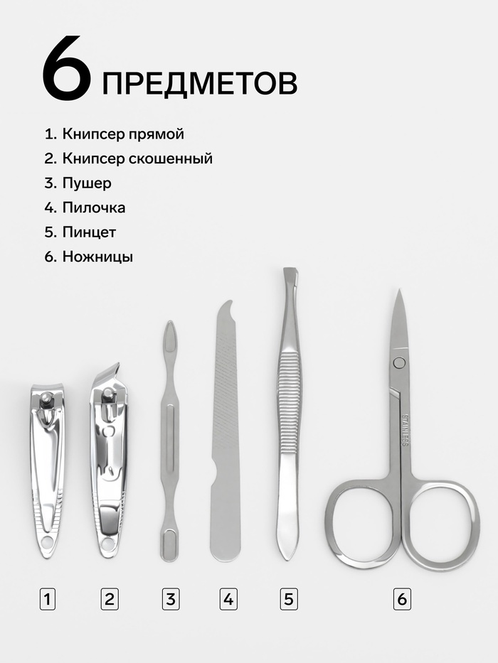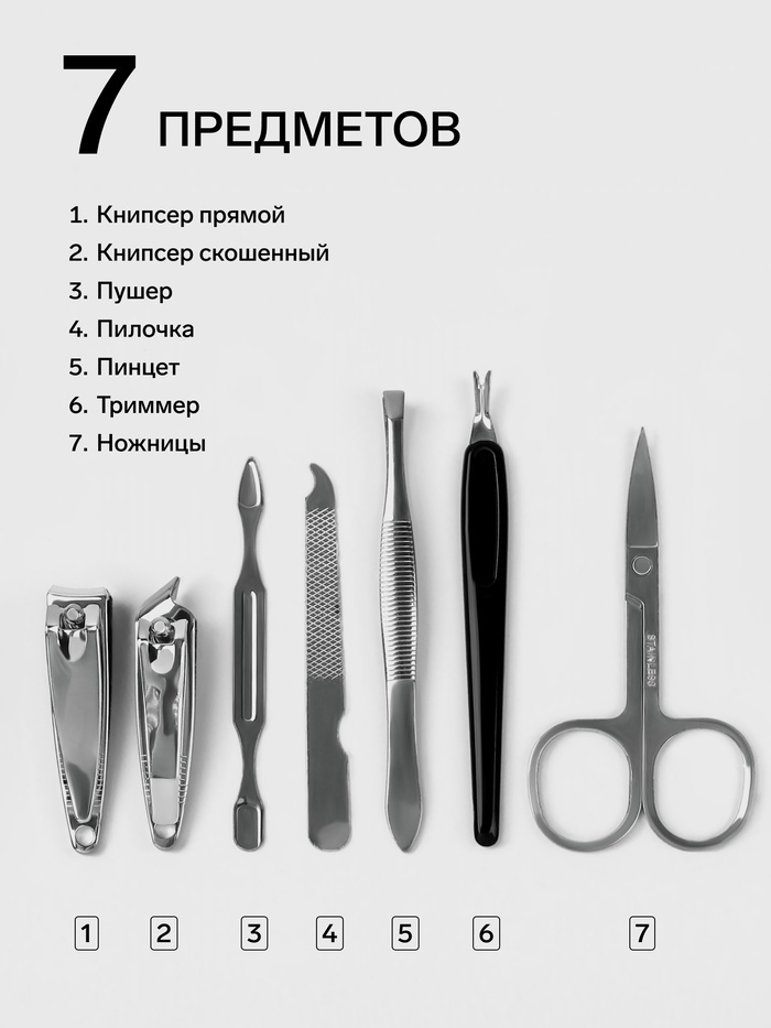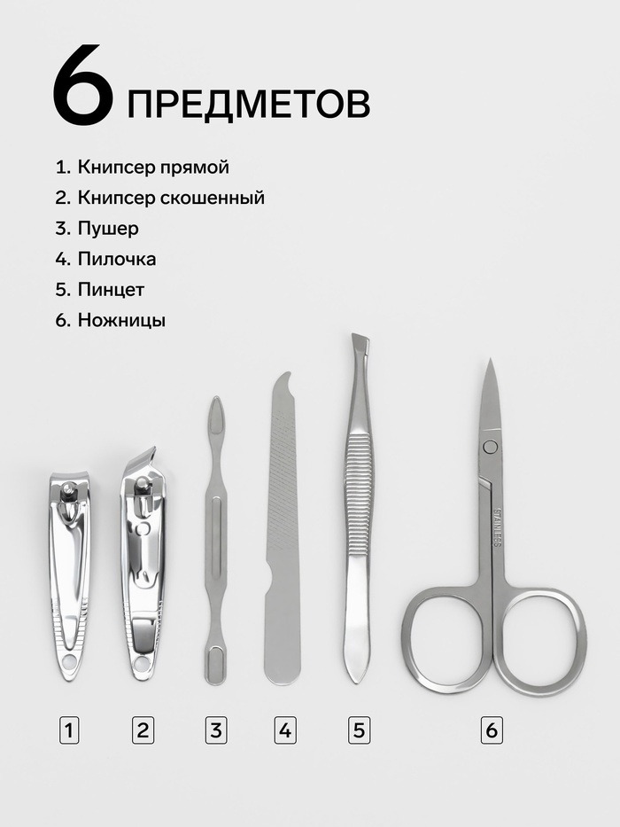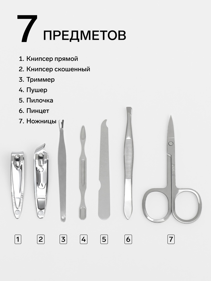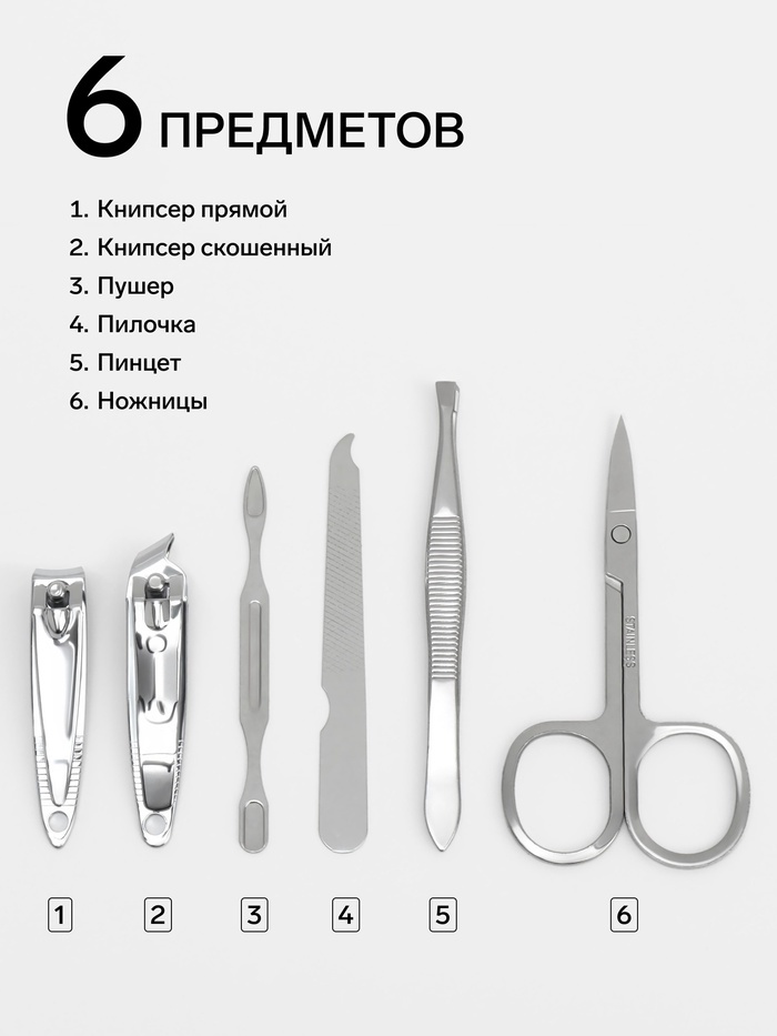 Комплект принадлежностей для маникюра пригодится дома, на работе и во время путешествий. В любых обстоятельствах эти инструменты помогут сохранить привлекательный внешний вид ваших рук. Комплектация *... Показать описание Ножницы, * Пинцет, * Книпсер - 2 шт., * Пилка, * Ухочистка, * Пушер.