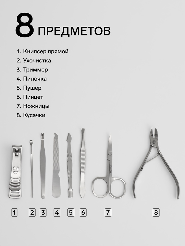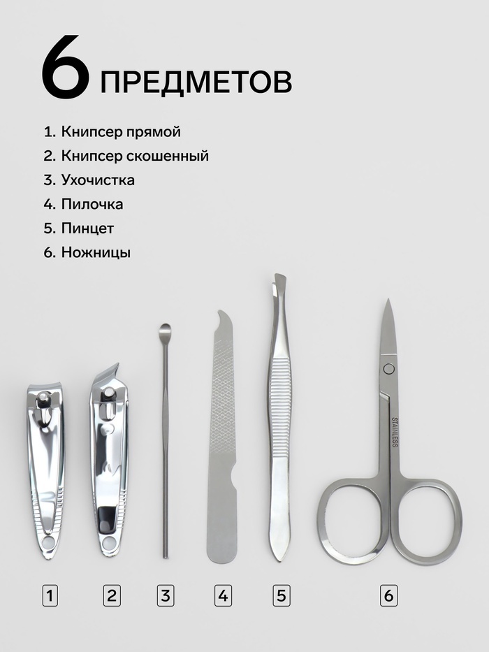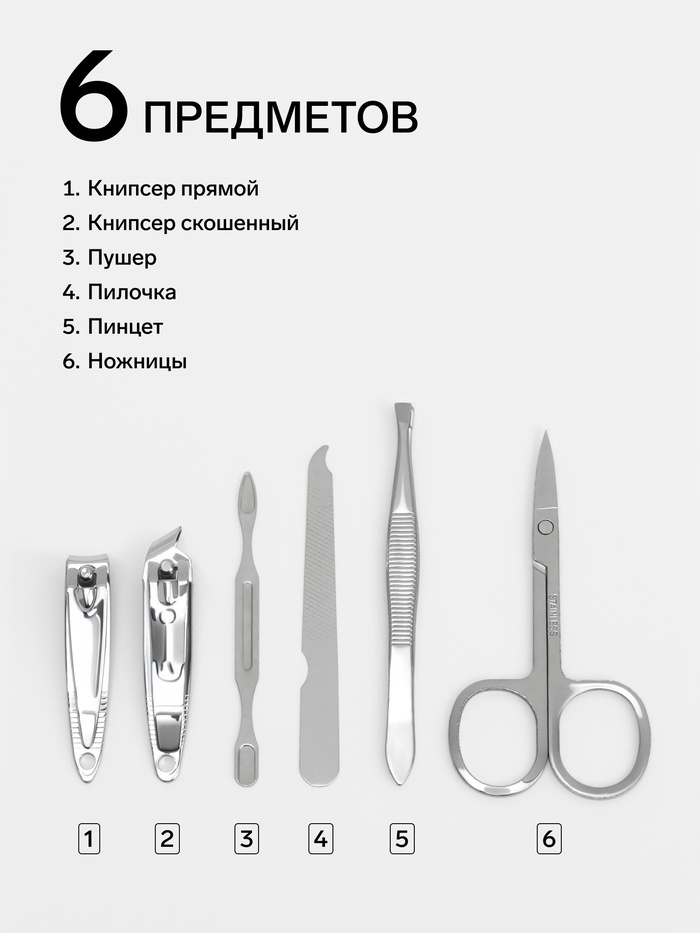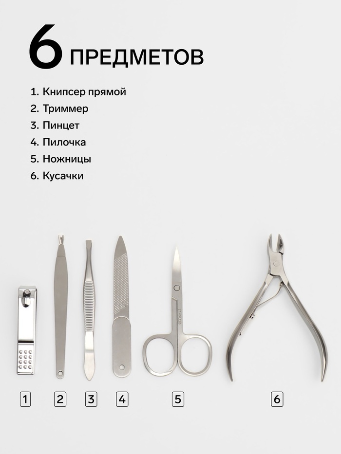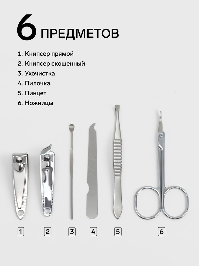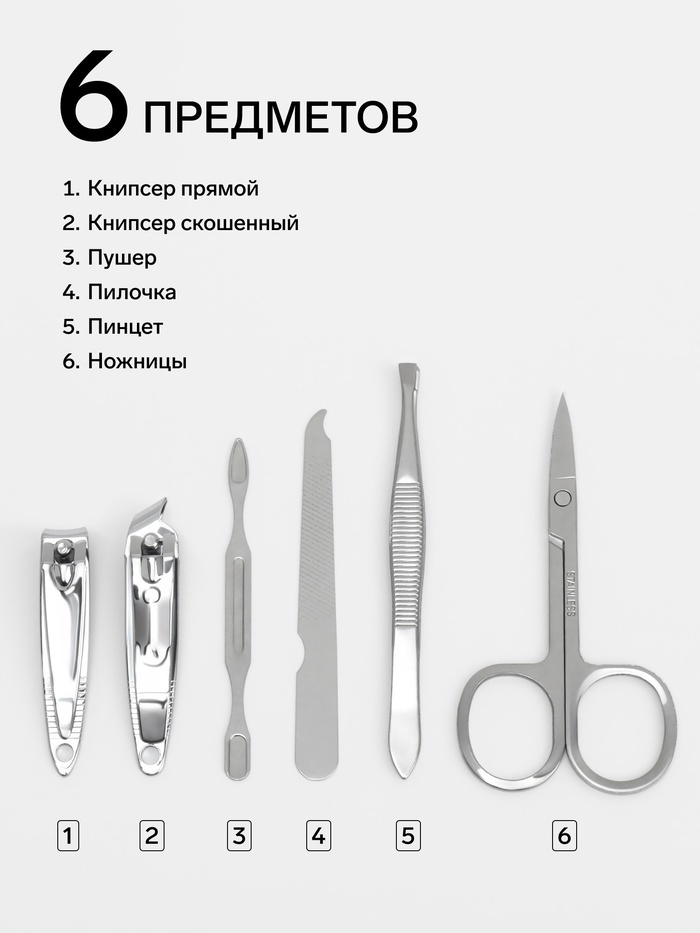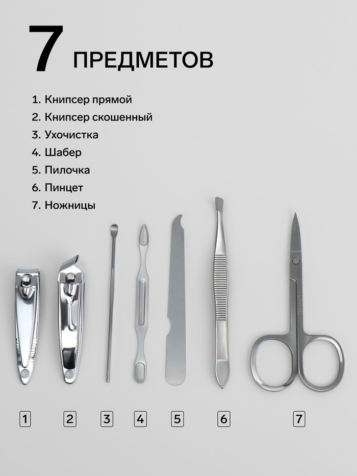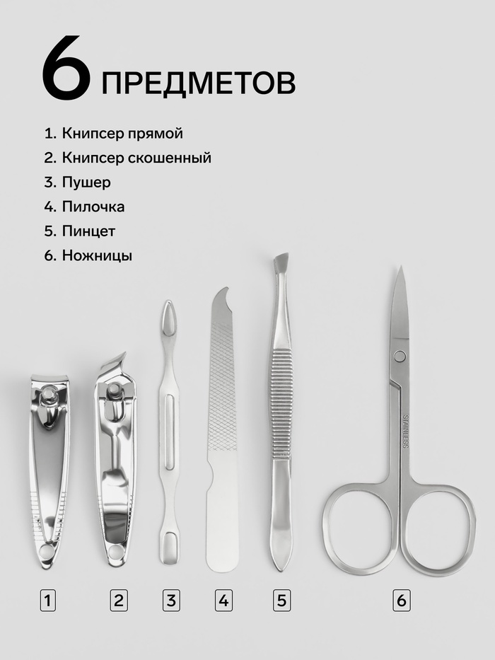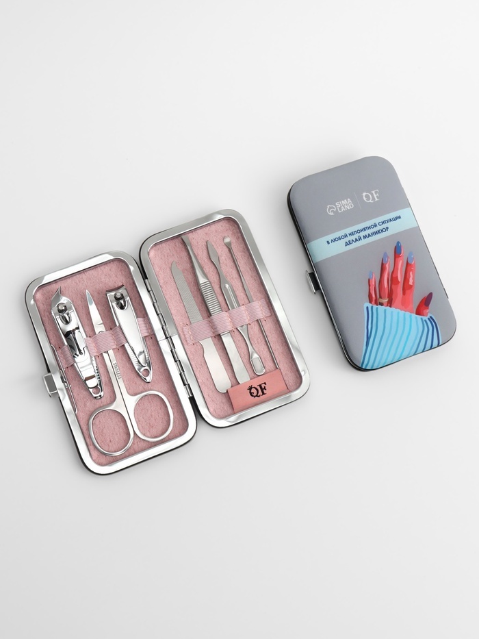 Комплект принадлежностей для маникюра пригодится дома, на работе и во время путешествий. В любых обстоятельствах эти инструменты помогут сохранить привлекательный внешний вид ваших рук. Маникюрный наб... Показать описаниеор с уникальным дизайном поднимет настроение и станет превосходным подарком для ваших близких. Комплектация * Ножницы, * Пинцет, * Книпсер – 2 шт, * Пушер, * Ухочистка, * Пилка.