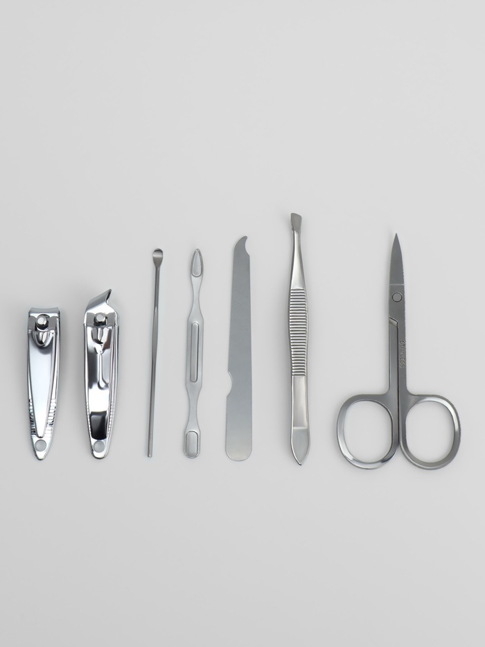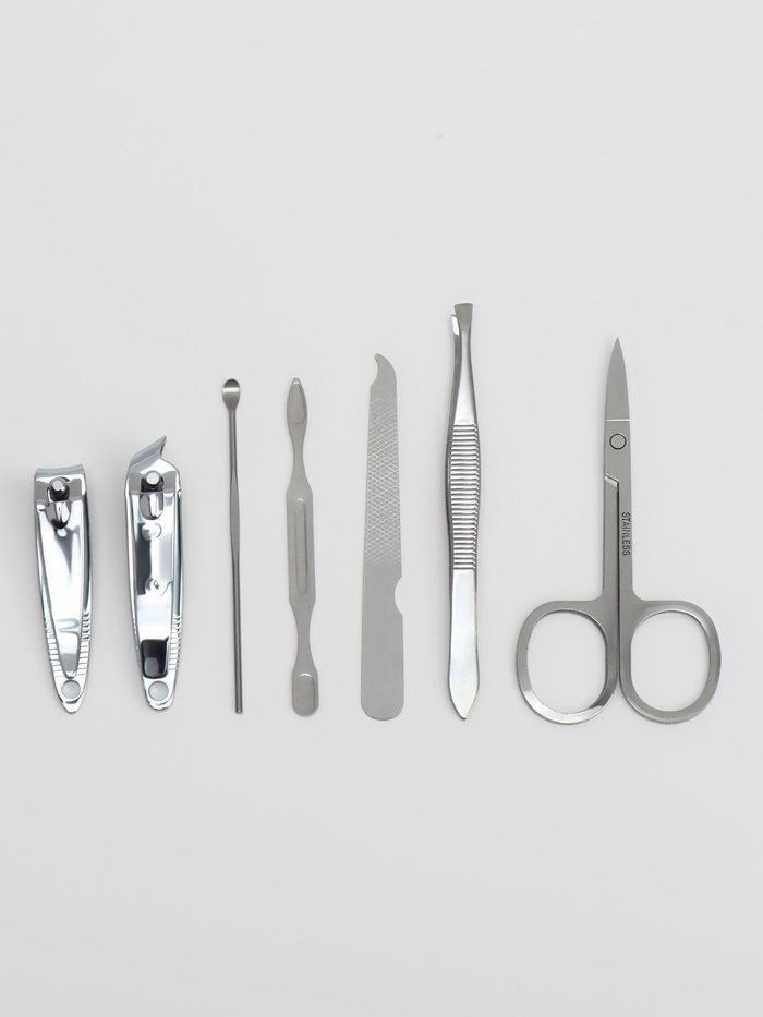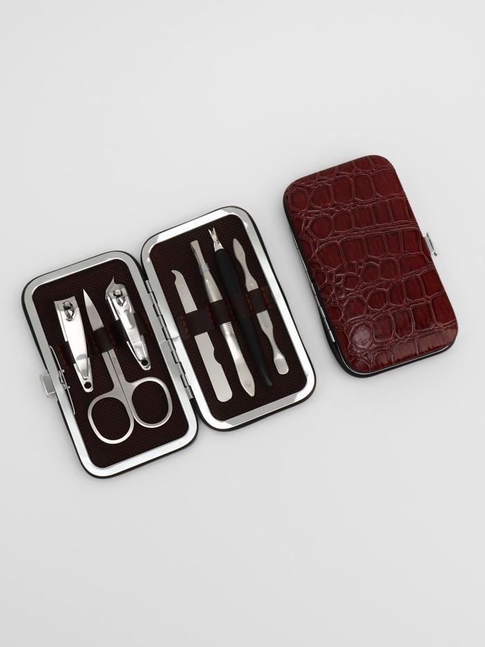 Маникюрный набор Style в чёрном футляре — это минимализм, порядок и готовность к уходу в любой момент. Восемь инструментов из нержавеющей стали собраны в компактный комплект, обтянутый искусственной к... Показать описаниеожей. Он одинаково уместен в домашнем обиходе, в поездке или как часть утреннего ритуала. Универсальный дизайн делает его подходящим не только для женщин, но и для мужчин, кто ценит аккуратность. Что включено * Футляр из искусственной кожи с защёлкой надёжно фиксирует содержимое и легко помещается в сумку. * Инструменты выполнены из нержавеющей стали — они устойчивы к коррозии и сохраняют остроту при регулярном использовании. * Чёрный цвет придаёт статусный вид: набор выглядит строго, без излишеств, подчёркивая внимание к деталям. * Подходит как подарок жене, маме, сестре или мужчине — универсальный выбор к любому поводу. Практика в деталях Этот набор решает повседневные задачи — от коррекции ногтей до ухода за кожей вокруг кутикулы и даже очистки ушей. Каждый элемент занимает своё место, что исключает хаос и потерю мелких предметов. Это не просто аксессуар, а система, которая помогает держать себя в порядке без лишних усилий. Подходит тем, кто предпочитает функциональность и лаконичный стиль. Комплектация * Книпсеры - 2 шт, * Ухочистка, * Косметологическая игла с петлёй, * Пинцет, * Пилочка, * Триммер, * Ножницы.