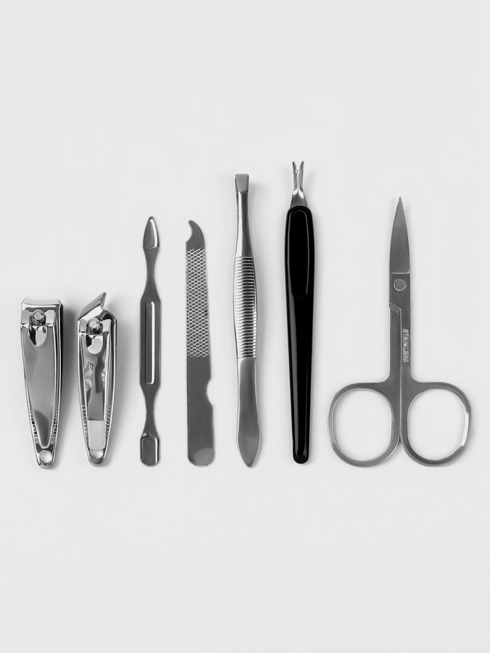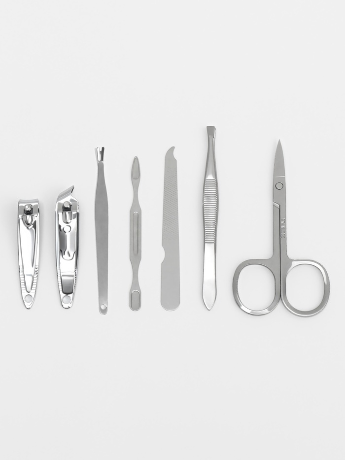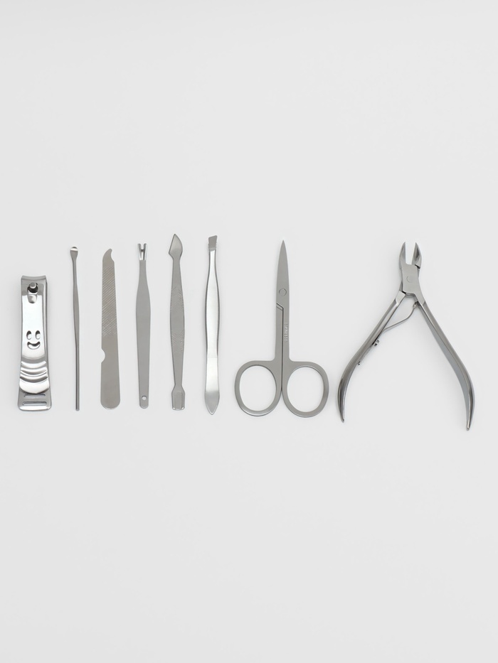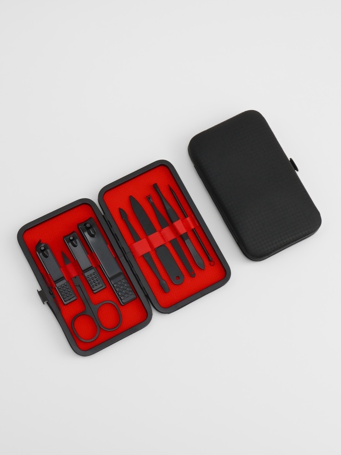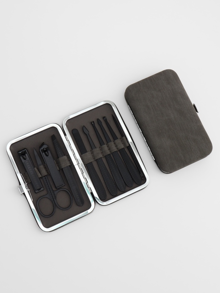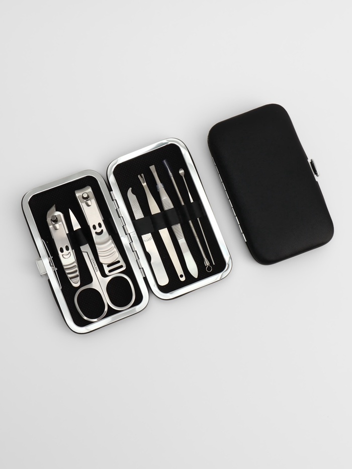 Маникюрный набор 11 в 1 — это всё, что нужно для ухода за ногтями, руками и ногами, собранное в одном месте. 11 качественных инструментов из нержавеющей стали, упакованных в чёрный футляр с защёлкой, ... Показать описаниеобеспечивают полный спектр домашнего маникюра. Универсальный и практичный — подходит как для повседневного использования, так и в качестве подарка. Особенности * 11 профессиональных инструментов * Футляр из искусственной кожи с защёлкой — удобно хранить и брать с собой. * Чёрный цвет и лаконичный дизайн делают набор универсальным и стильным. * Подходит для мужчин и женщин — практичное решение для всей семьи. * Идеально подходит как подарок к любому случаю — от дня рождения до новогодних праздников. Уход без компромиссов Этот набор создан для тех, кто ценит аккуратность и комфорт. Каждый инструмент продуман до мелочей, чтобы процедура ухода была не просто необходимостью, а моментом, на который хочется выделить время. Нержавеющая сталь обеспечивает долговечность, а удобный футляр — порядок и защиту. Это не просто набор для ногтей — это ваш личный мастер на каждый день. Комплектация В наборе: * Книпсер прямой * Книпсер скошенный * Пушер * Ухочистка * Триммер * Косметологическая игла * Пилочка * Пинцет * Книпсер прямой * Ножницы * Кусачки