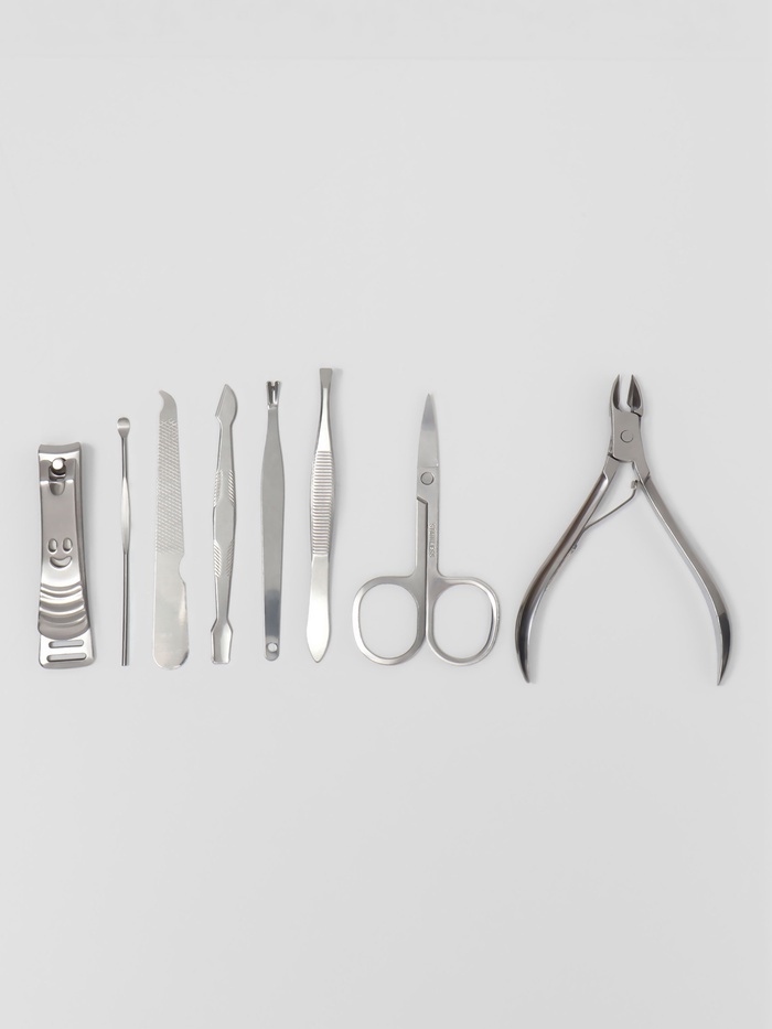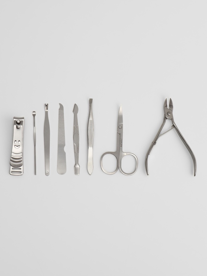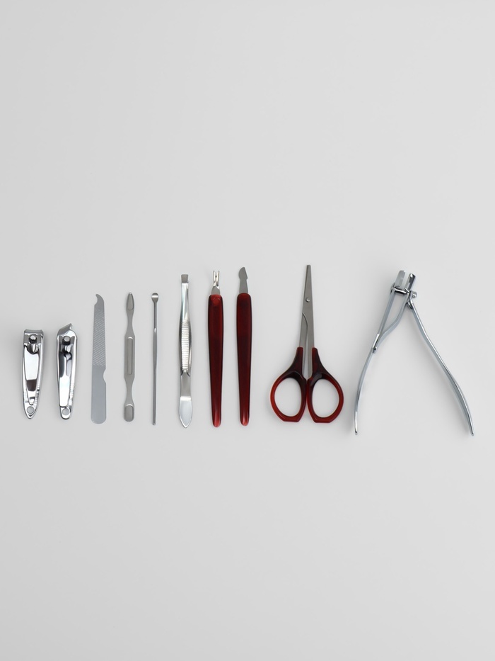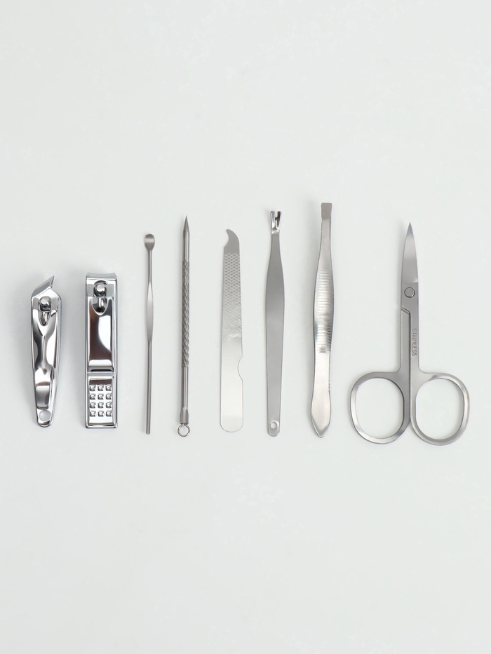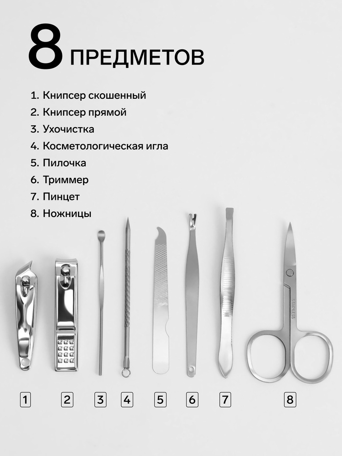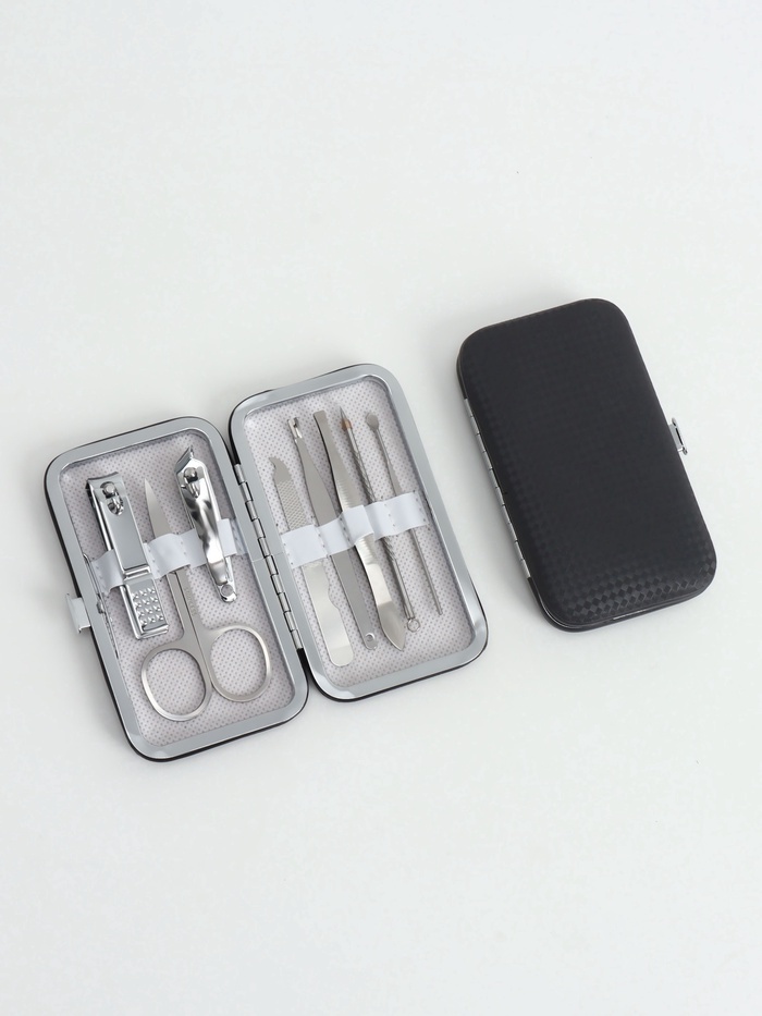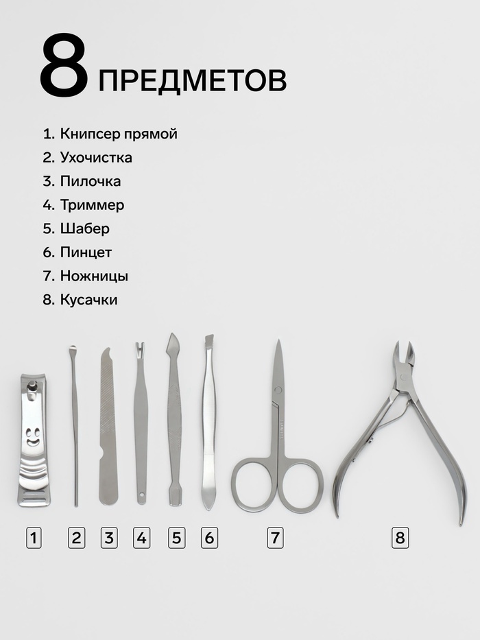 Маникюрный набор 11 в 1 — это всё, что нужно для ухода за ногтями, руками и ногами, собранное в одном месте. 11 качественных инструментов из нержавеющей стали, упакованных в чёрный футляр с защёлкой, ... Показать описаниеобеспечивают полный спектр домашнего маникюра. Универсальный и практичный — подходит как для повседневного использования, так и в качестве подарка. Особенности * 11 профессиональных инструментов * Футляр из искусственной кожи с защёлкой — удобно хранить и брать с собой. * Чёрный цвет и лаконичный дизайн делают набор универсальным и стильным. * Подходит для мужчин и женщин — практичное решение для всей семьи. * Идеально подходит как подарок к любому случаю — от дня рождения до новогодних праздников. Уход без компромиссов Этот набор создан для тех, кто ценит аккуратность и комфорт. Каждый инструмент продуман до мелочей, чтобы процедура ухода была не просто необходимостью, а моментом, на который хочется выделить время. Нержавеющая сталь обеспечивает долговечность, а удобный футляр — порядок и защиту. Это не просто набор для ногтей — это ваш личный мастер на каждый день. Комплектация В наборе: * Книпсер прямой * Книпсер скошенный * Пушер * Ухочистка * Триммер * Косметологическая игла * Пилочка * Пинцет * Книпсер прямой * Ножницы * Кусачки