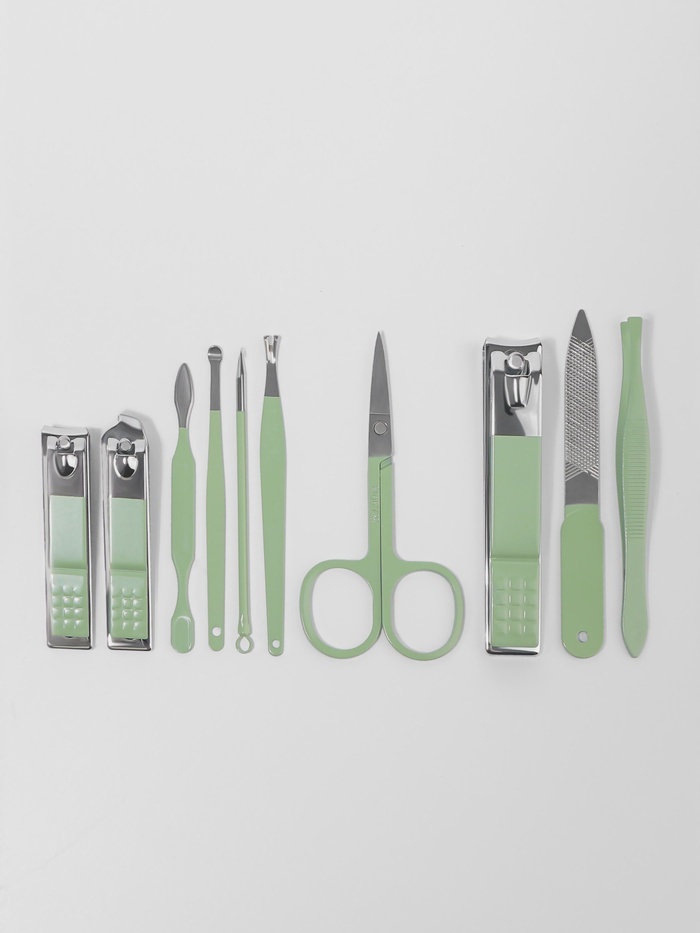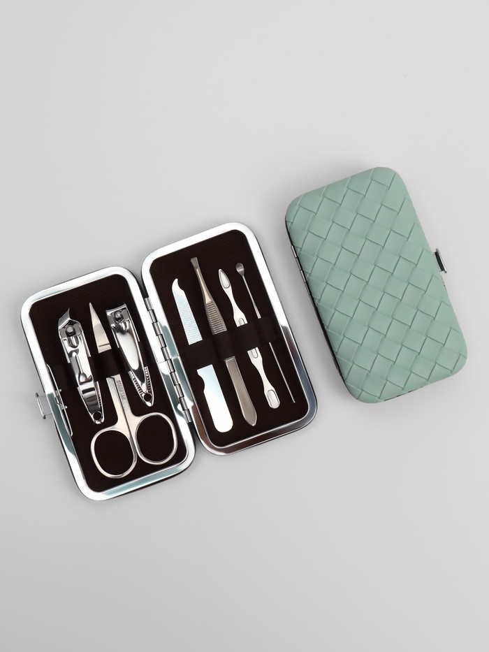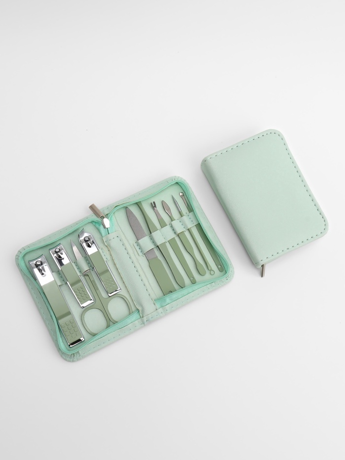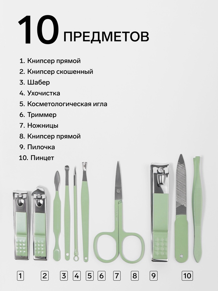 Маникюрный набор 10 в 1 в мятном футляре — это продуманный комплект для ухода за руками, ногами и ногтями. Всё необходимое собрано в одном месте: 10 качественных инструментов из металла, надёжно закре... Показать описаниеплённых в футляре из искусственной кожи с застёжкой-молнией. Удобный, прочный и стильный — подходит как для повседневного использования, так и в качестве универсального подарка. Особенности * 10 функциональных инструментов: пинцет, ножницы, пилка, книпсер, шабер, триммер, ухочистка и косметологическая игла. * Футляр с молнией обеспечивает полную защиту содержимого и удобное хранение. * Мятный цвет добавляет свежести и современного стиля. * Подходит для мужчин и женщин — практичный аксессуар без гендерных рамок. * Идеален для дома, путешествий или в качестве подарка к любому событию. Ухоженные руки начинаются с правильных инструментов Этот набор создан для тех, кто ценит порядок, чистоту и эффективность. Каждый элемент выполняет свою задачу точно и без лишних усилий. Футляр сохраняет инструменты в безопасности и не даёт им теряться. Это не просто маникюрный комплект — это ваш личный ритуал ухода, который легко взять с собой и использовать в любой момент. Комплектация В наборе: * Книпсер прямой * Книпсер скошенный * Ухочистка * Косметологическая игла * Пушер * Пилка * Триммер * Пинцет * Ножницы * Книпсер прямой
