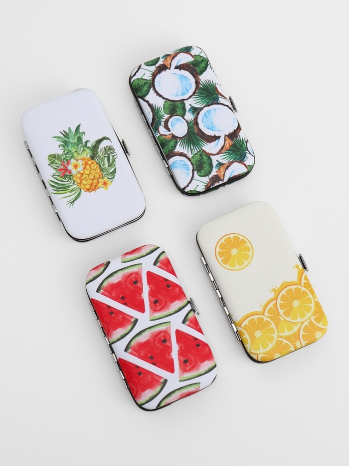 Фруктовый маникюрный набор — это шесть профессиональных инструментов в ярком футляре с защёлкой. Комплект с жизнерадостным дизайном превращает уход за ногтями в приятный ритуал. Женщины выбирают этот ... Показать описаниенабор за сочетание функциональности и летнего настроения, которое дарят фруктовые принты. Что делает этот набор особенным * Яркий футляр с фруктовым рисунком поднимает настроение при каждом использовании * Металлические инструменты профессионального уровня для всех этапов маникюра * Компактный размер удобен для хранения на туалетном столике или в дорожной косметичке * Надёжная защёлка защищает содержимое от случайного открытия Почему стоит выбрать В отличие от обычных маникюрных наборов, этот комплект выделяется оригинальным дизайном. Фруктовые мотивы на инструментах и футляре добавляют индивидуальности. Все предметы выполнены из качественного металла, который не теряет остроту со временем. Набор особенно порадует тех, кто ценит не только функциональность, но и эстетику. Идеальный подарок Такой комплект станет неожиданным и практичным презентом на 8 Марта, День рождения или просто как знак внимания. Его оценят подруги, сестры или мамы, которые следят за ухоженностью рук. Фруктовый дизайн напоминает о лете и создаёт позитивный настрой даже в пасмурные дни. Комплектация В наборе: * Книпсер прямой * Книпсер скошенный * Пушер * Пилка * Пинцет * Ножницы