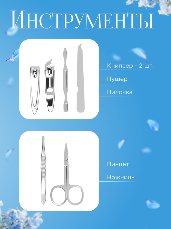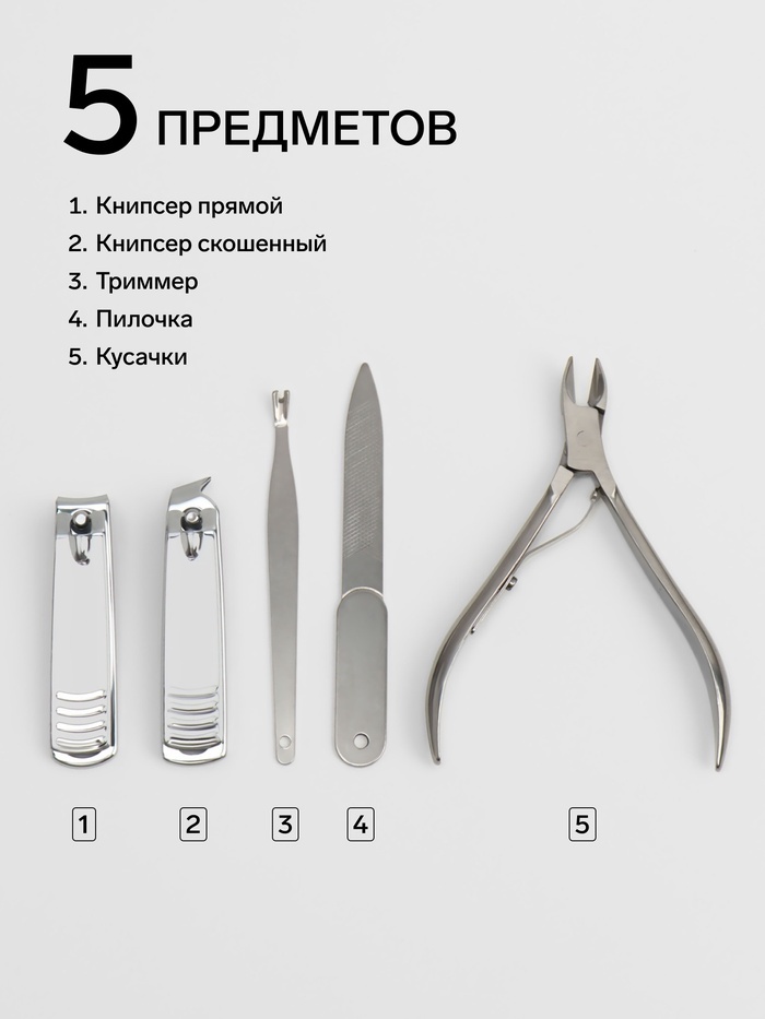 Комплект принадлежностей для маникюра пригодится дома, на работе и во время путешествий. В любых обстоятельствах эти инструменты помогут сохранить привлекательный внешний вид ваших рук. Комплектация *... Показать описание Ножницы, * Пинцет, * Книпсер - 2 шт., * Пилка,