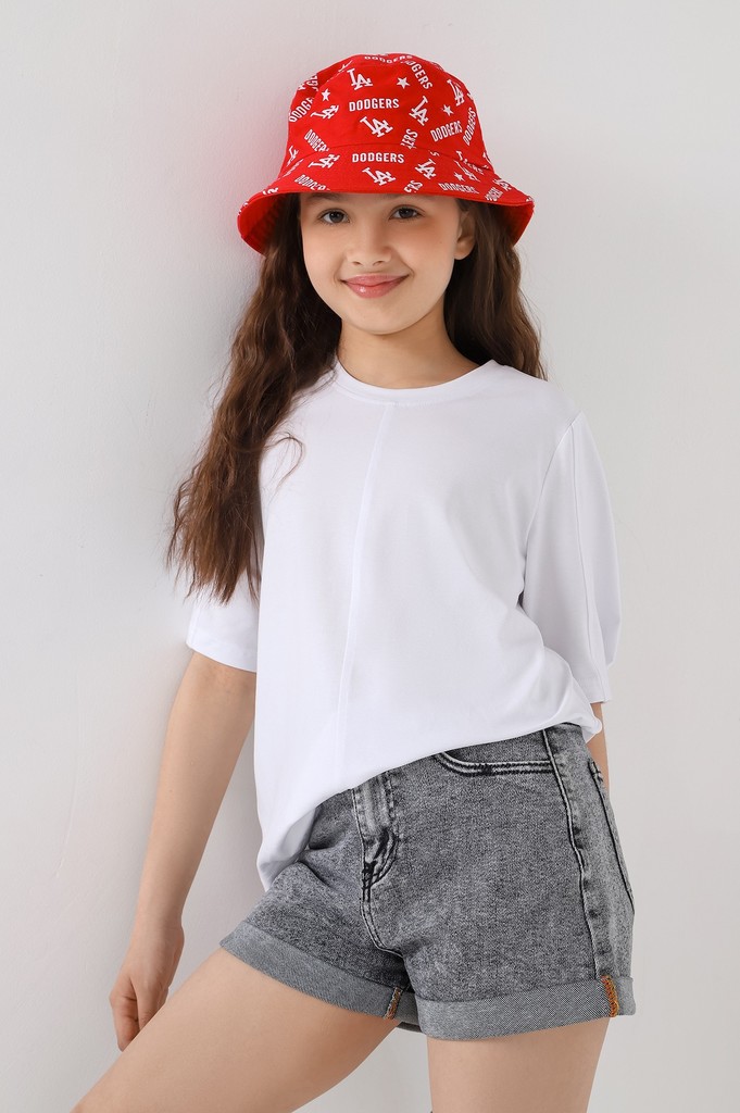 Футболка детская из гладкокрашеного трикотажного полотна "кулирка", модного силуэта, слегка укороченная, свободного покроя, с приспущенным плечом, втачными рукавами длиной до локтя, горловиной овально... Показать описанией формы, обработанной втачной планкой и принтом в центре переда. По шву втачивания планки настрочена отделочная строчка. Низ изделия и нижние срезы рукавов обработаны швом вподгибку.
