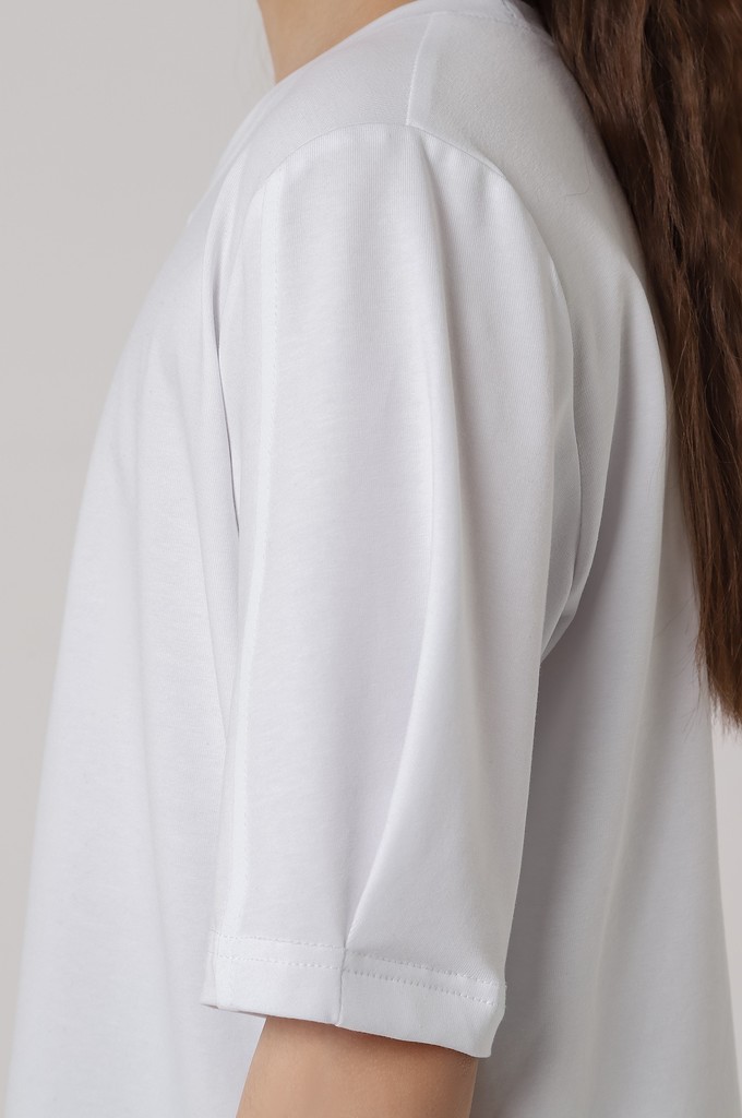 Футболка для девочек модной объемно-силуэтной формы, с вертикальным отстроченным швом по центру переда. На рукавах также выполнены декоративные вертикальные отстроченные швы и глубокие защипы по низу.