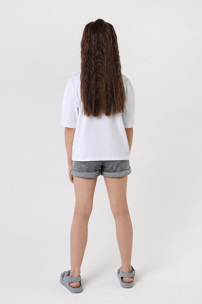Футболка для девочки, модной объемно-силуэтной формы, свободная в верхней части. Модель с наклонными отстроченными швами по переду и спинке, фигурной линией низа (с небольшим удлинением сзади). Рукава... Показать описание короткие цельнокроенные.