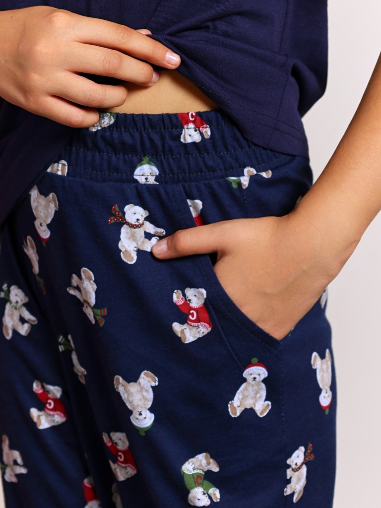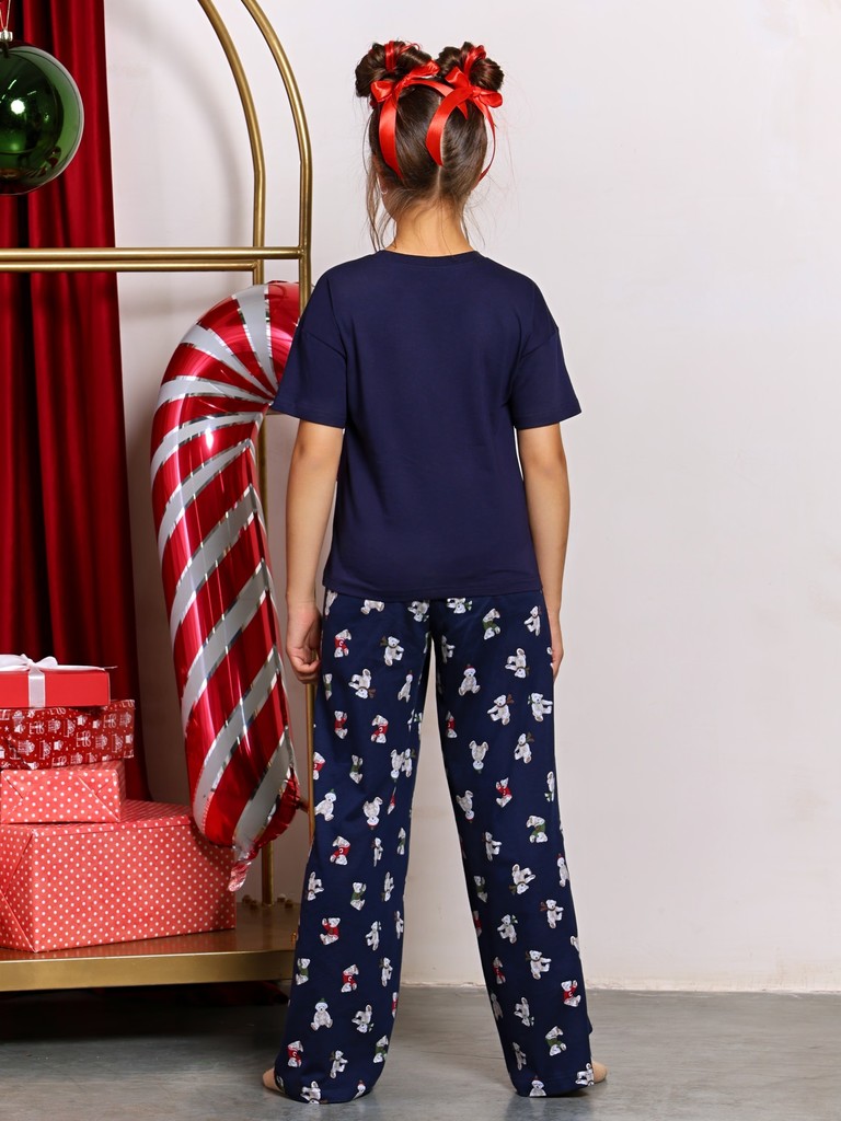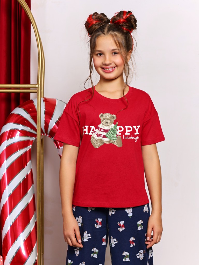 Пижама для девочки из трикотажного полотна "кулирка", состоящая из футболки и брюк. Футболка - из гладкокрашеного полотна, слега расширенная и укороченная, с втачными короткими рукавами, горловиной ов... Показать описаниеальной формы, обработанной втачной планкой и принтом в центре переда, выполненным в технике шелкографии. Брюки из полотна с набивным тематическим рисунком, длинные, с эластичной тесьмой по талии и нижним срезами.