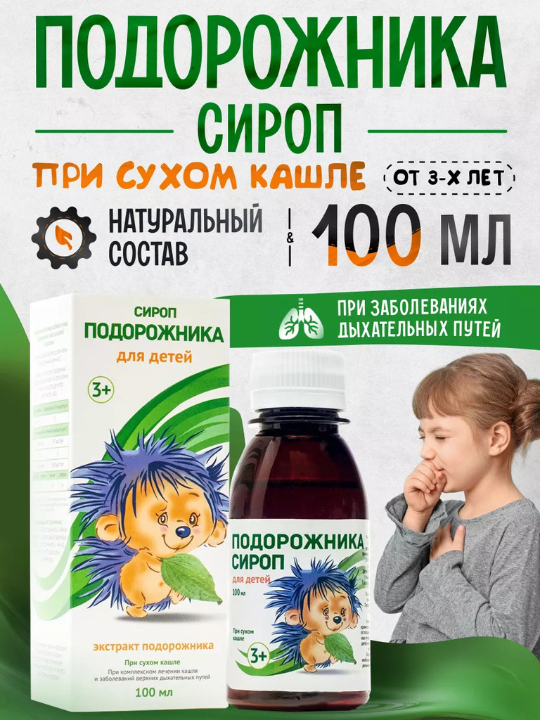 Подорожника сироп для детей Сироп при комплексном лечении кашля и заболеваний верхних дыхательных путей и сухом кашле. В составе сиропа экстракт подорожника. Для детей с 3-х лет. Применение: Детям с 3... Показать описание до 11 лет принимать 1 чайную ложку (5 мл) 2 раза в день во время еды. Детям с 11 до 14 лет принимать 1 чайную ложку (5 мл) 3 раза в день во время еды. Перед употреблением взболтать. Продолжительность приёма — 14 дней. Состав: Cахар, вода, мята перечная лист, чабрец трава, подорожник большой лист, трава душицы обыкновенной, аскорбиновая кислота (витамин С), лимонная кислота (регулятор кислотности).