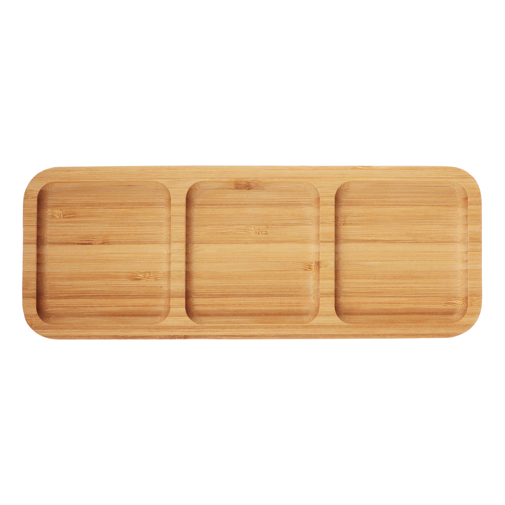 Деревянная менажница VETTA 25x9,5x1,5 см - отличный вариант для стильной сервировки стола, подачи завтрака или перекуса, например, в офис. Благодаря трем секциям на неё можно уместить несколько разных... Показать описание блюд, не смешивая их друг с другом. Прямоугольная, узкая форма придает менажнице элегантный и современный вид, и позволяет разместить ее на любом столе. Обратную сторону можно использовать как разделочную доску. Материал: бамбук. Деревянная менажница VETTA идеально подходит для использования на любых торжественных мероприятиях или просто на повседневном ужине с семьей и друзьями. Также может служить отличным подарком для любителей красивой и функциональной посуды.