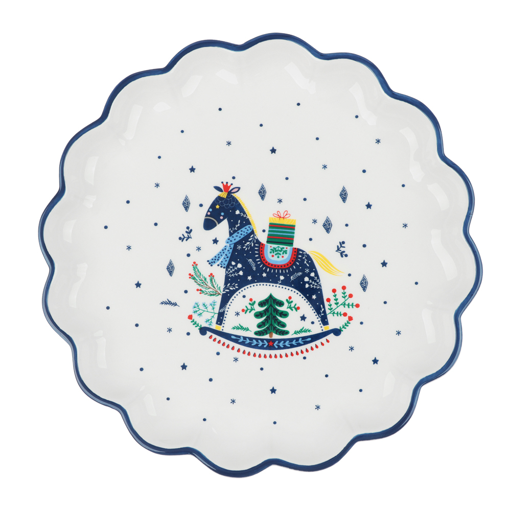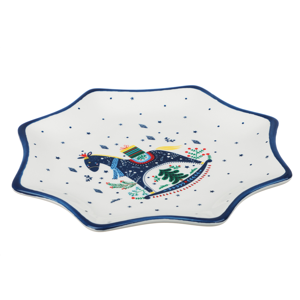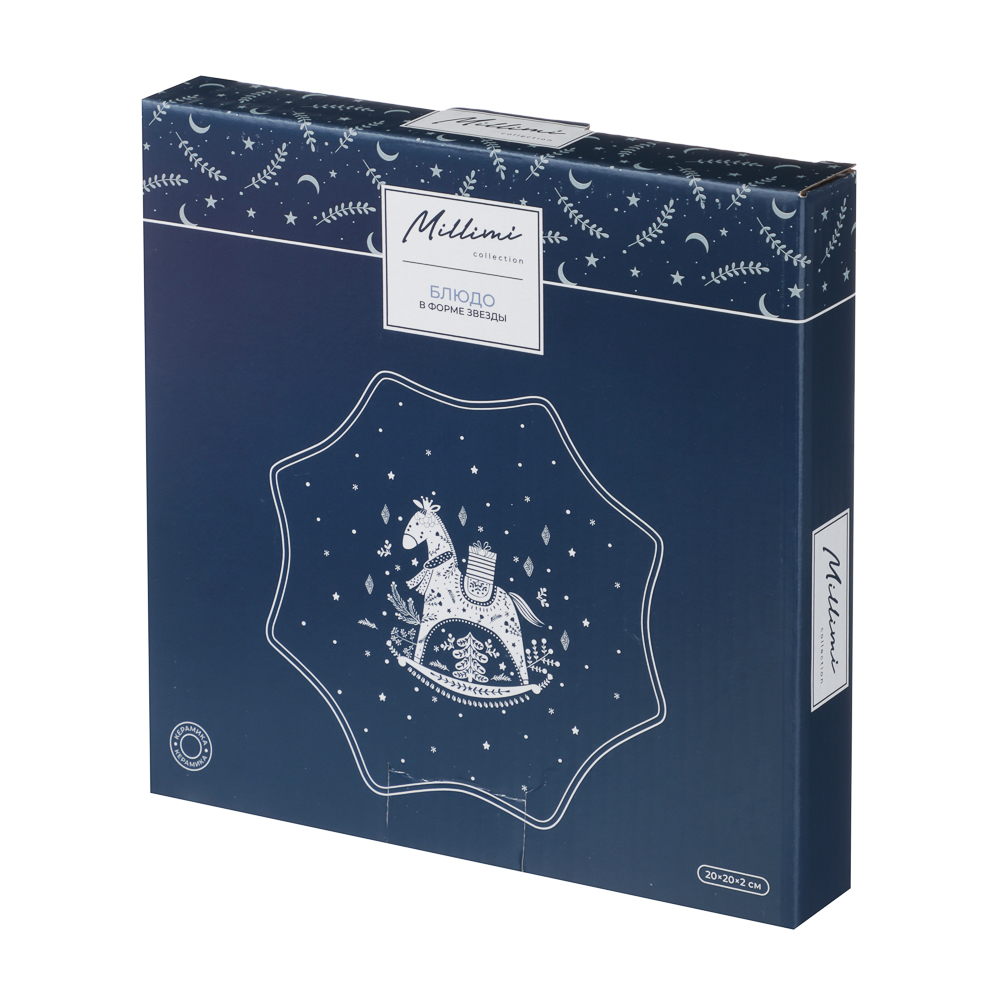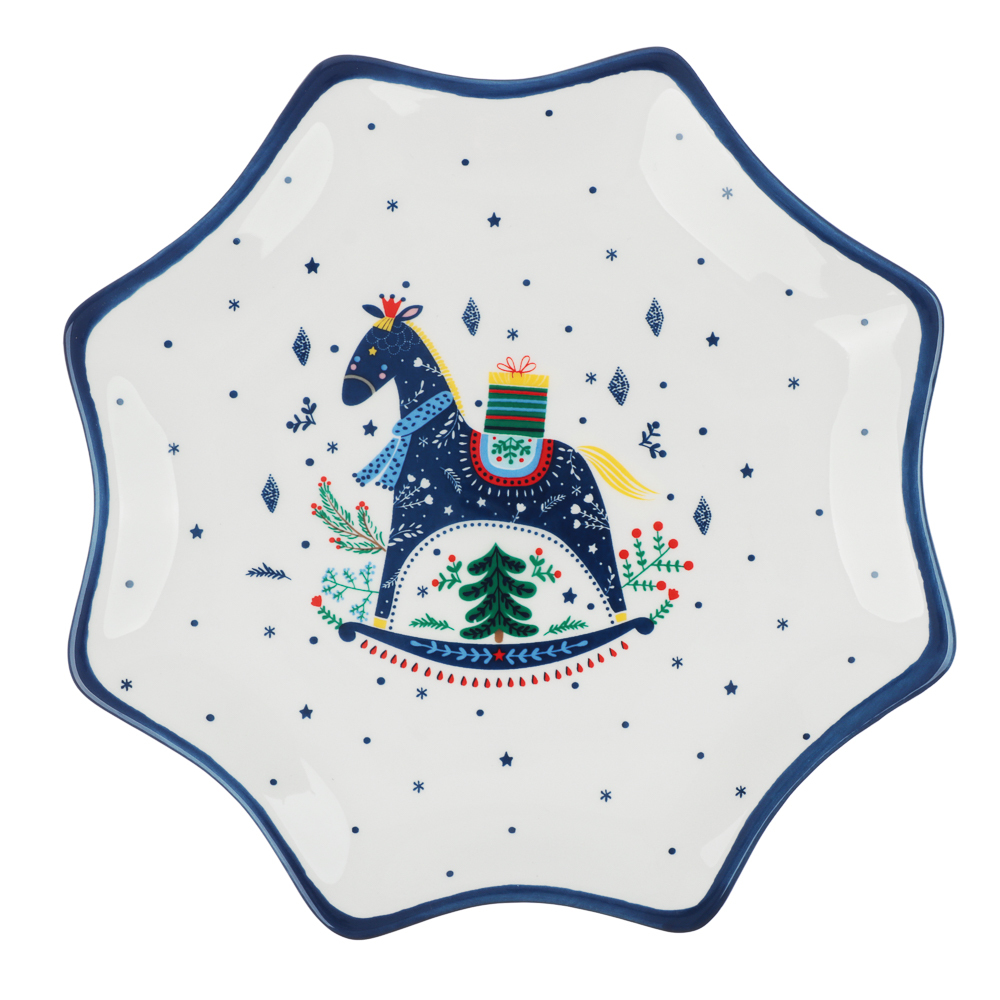 Блюдо в форме звезды MILLIMI «Нордик», 20х20х2 см поможет организовать сервировку в новогоднем стиле и обозначит повод для торжества. Керамическое блюдо имеет лаконичный дизайн с принтом с изображение... Показать описанием лошади с елкой и подарками, сделает сервировку особенной, создавая уютную атмосферу семейного праздника. Может использоваться для подачи сладостей, канапе и других закусок, а также салатов или фруктов на общий стол. Сочетается с посудой из одноименной коллекции, а также комбинируется с любой другой посудой. Качественная керамика легко моется, не впитывает запахи, обладает повышенной прочностью.