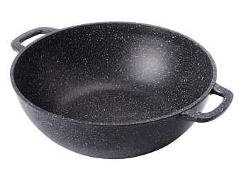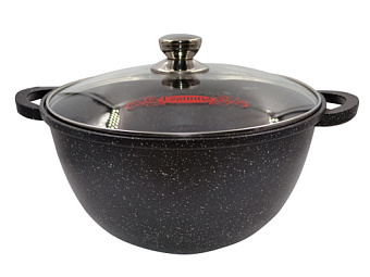 Применяется трёхслойное покрытие с мраморным эффектом Серия Гранит - это посуда со стилистикой гранитной крошки. Благодаря классическому черному цвету, который соединяется с белым крапом, мы получаем ... Показать описаниеповерхность как природный минерал. Нужно отметить, что это не только дизайнерское решение: благодаря дополнительному слою, покрытие действительно более износостойкое.