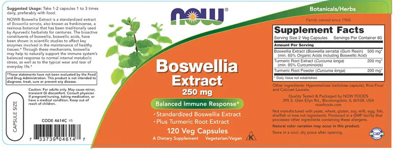 Преимущества Boswellia Extract 250 mg: * Мощные противовоспалительный и антисептический эффекты * Анальгезирующее воздействие * Ранозаживляющие и восстанавливающие свойства * Улучшение работы печени *... Показать описание Нормализация пищеварения Босвеллия родом из индийской народной медицины, где это растение широко применялось для исцеления мышц, суставов, нервных окончаний от различных воспалительных процессов и заболеваний, например, артритах. Она эффективно снимает воспаления, оказывает антисептический, а также обезболивающий и ранозаживляющий эффекты. Кроме того, босвеллия стимулирует кровообращение и укрепляет сосуды. Этот компонент, в виде экстракта, является основой добавки и содержится в количестве 500 мг на порцию. Помимо босвеллии, в составе Boswellia Extract NOW, присутствует 200 мг куркумы, которая содержит кальций, железо, витамины С, В1, В2, В3, кортизон, фенилбутазон и другие вещества. У нее также есть противовоспалительный эффект, что благотворно влияет на суставные и хрящевые ткани, а кроме того, она является детоксикационным компонентом, стимулирует процесс пищеварения, улучшает работу поджелудочной железы. Биологически активная добавка (БАД). Не является лекарственным средством.