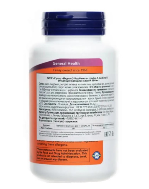 Индол-3-карбинол является мощным онкопротектором, поскольку: * модулирует метаболизм эстрогенов в печени, уменьшая долю канцерогенных метаболитов, и, наоборот, увеличивая концентрацию онкопротективных... Показать описание фракций; * блокирует биохимическую активность альфа- рецепторов для эстрогена в эпителиальных и опухолевых клетках; * непосредственно блокирует клеточный цикл опухолевых клеток; * увеличивает активность детоксицирующих ферментов печени, метаболизирующих различные токсины и канцерогены; * обеспечивает мощную антиоксидантную защиту, спасая от повреждений свободными радикалами кислорода; способствует апоптозу (смерти) раковых клеток. Лигнаны в толстом кишечнике в результате микробного метаболизма превращаются в активные фитоэстрогены – энтеролактон и энтеродиол, которые нормализуют гормональный баланс и также защищают репродуктивные органы от развития гормонально зависимого рака. Антираковая активность фитоэстрогенов обусловлена тем, что: * подобно лекарственному препарату тамоксифену блокируют альфа-рецепторы на клетках эпителия и раковых клетках от избыточной пролиферации под действием эстрогена; * блокируют активность фермента ароматазы жировых клеток молочной железы, предупреждая локальное образование высоких концентраций эстрогена; * стимулируют синтез в печени специальных белков, связывающих половые гормоны в плазме крови, что приводит к снижению концентрации эстрогенов в крови; * помимо этого фитоэстрогены являются антиоксидантами, обладают антиатерогенным и антитромботическим действием, предотвращают возрастную резорбцию кости и развитие остеопороза. Показания к применению now foods Индол-3-карбинола * Профилактика и терапия онкологических заболеваний женской и мужской половой сферы, включая рак молочной железы, матки, яичников, фиброму матки, кистозно-фиброзную мастопатию, эндометриоз у женщин, рак простаты у мужчин. * Предменструальный синдром. * Детоксикация организма. * Остеопороз. * Атеросклероз. * Повышенная свёртываемость крови. Биологически активная добавка (БАД). Не является лекарственным средством.